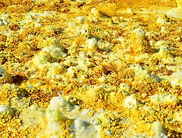 산화되어 온통 새빨갛게 물든 바닥과 그 위에 노란꽃을 무더기로 피워놓은 유황 알갱이들