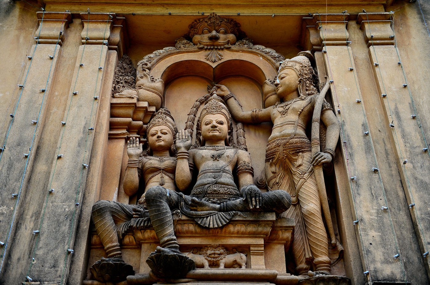 사원의 외부 벽면은 이것이 불교 사원일까 라는 의구심이 들 정도로 힌두교 색채가 강한 많은 조각품들로