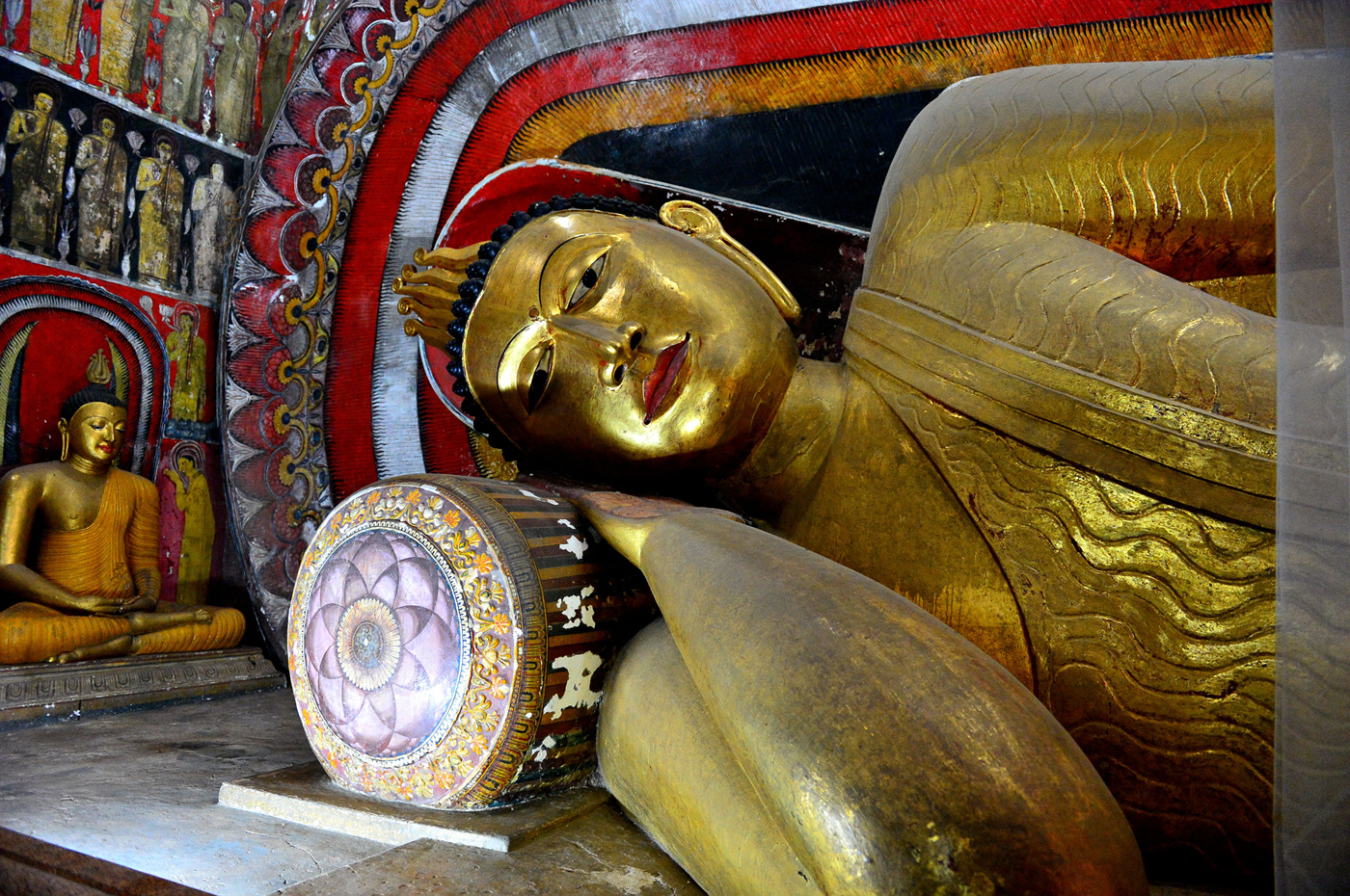 황금빛으로 치장한 커다란 와불이 법당을 가득 메우고 있다.