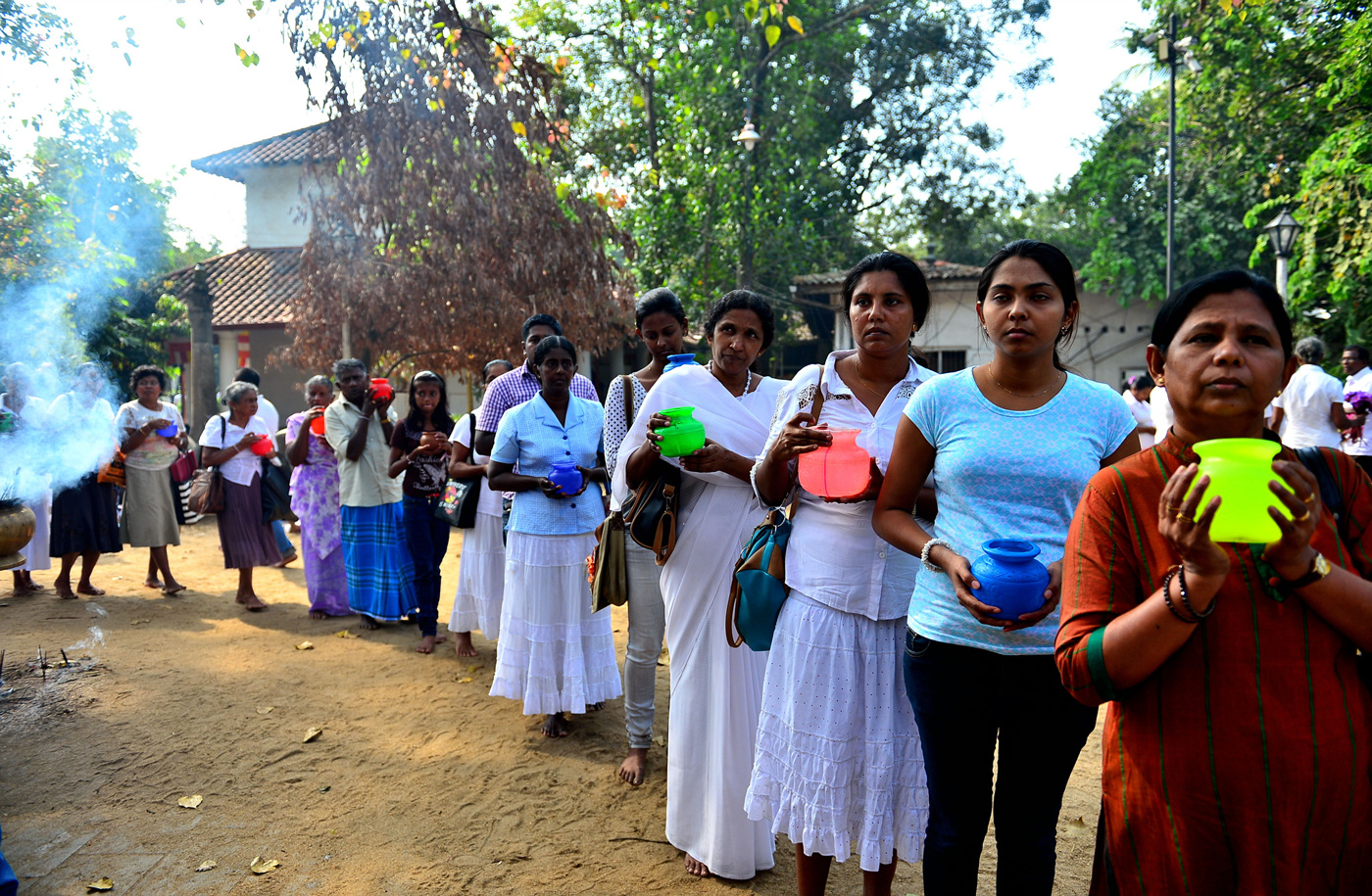 야외의 부처상 앞으로 여인들의 행렬이 길게 이어져 있는데 손에는 제각기 작은 항아리가 들려 있다.