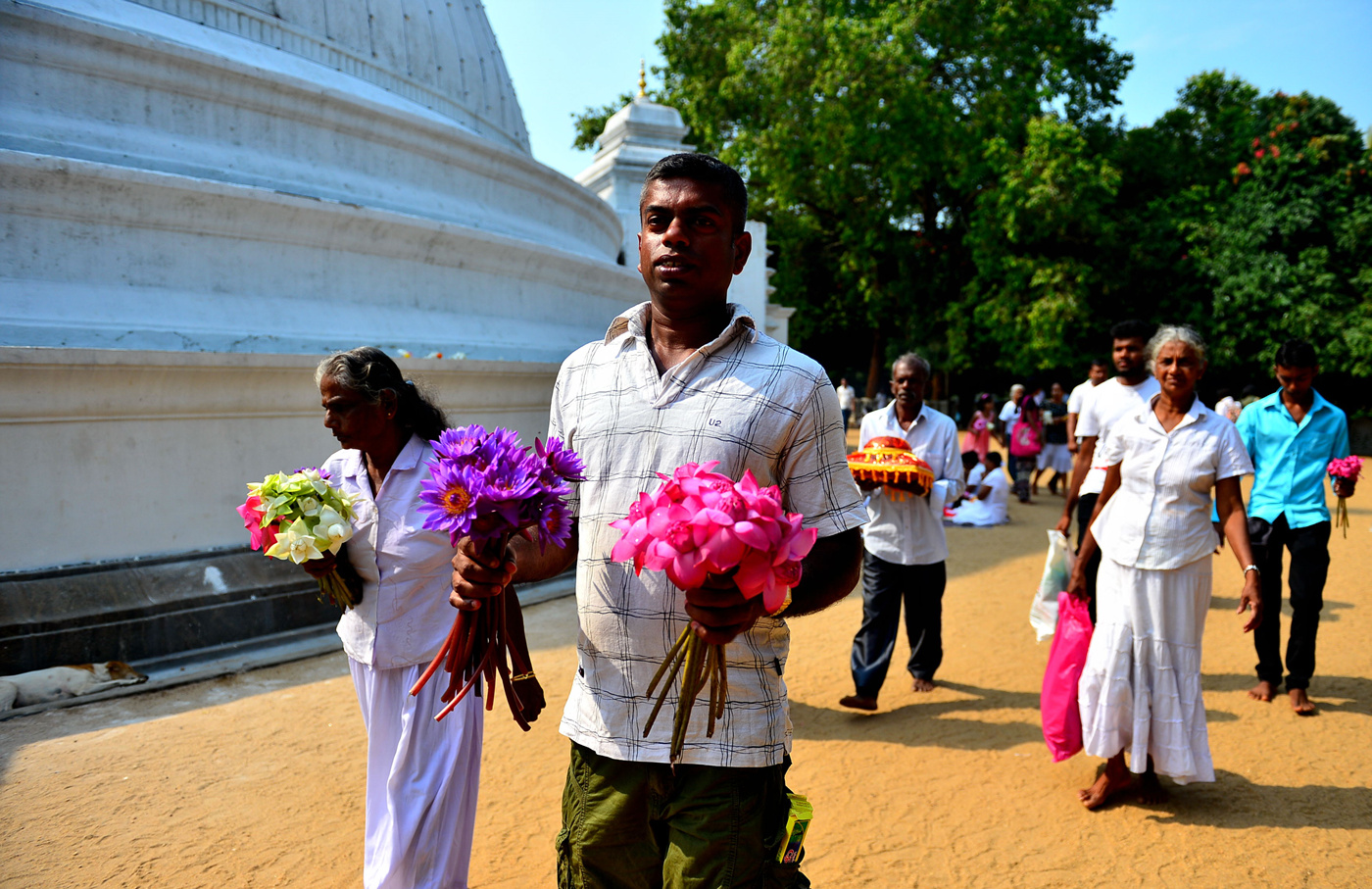 꽃을 들고 사원을 찾은 참배객 모습이다.