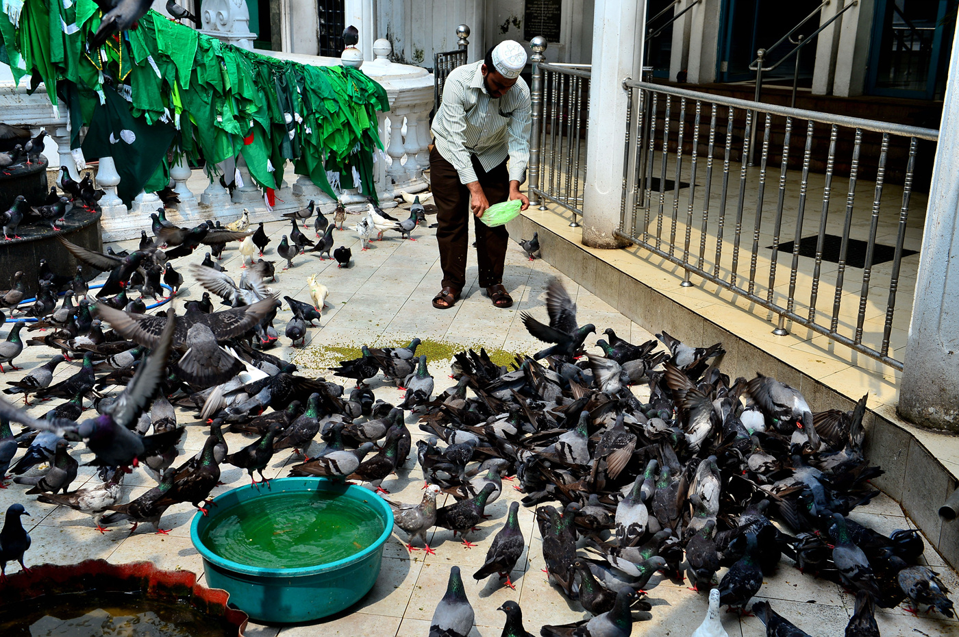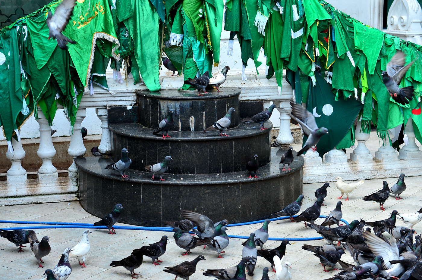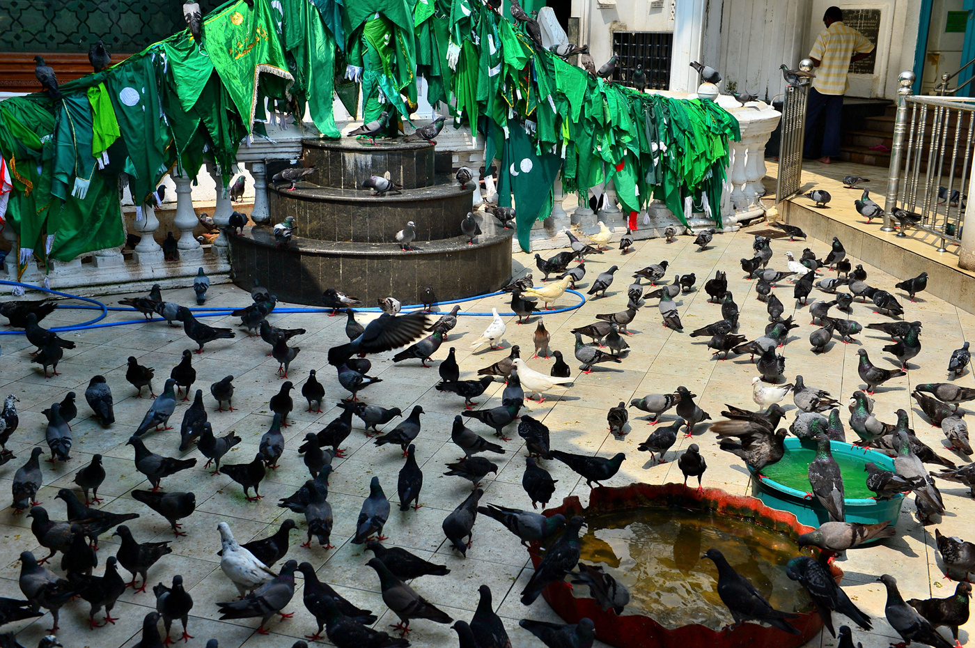 사원 앞 마당의 수많은 비둘기 떼다.