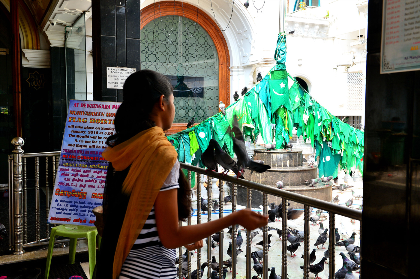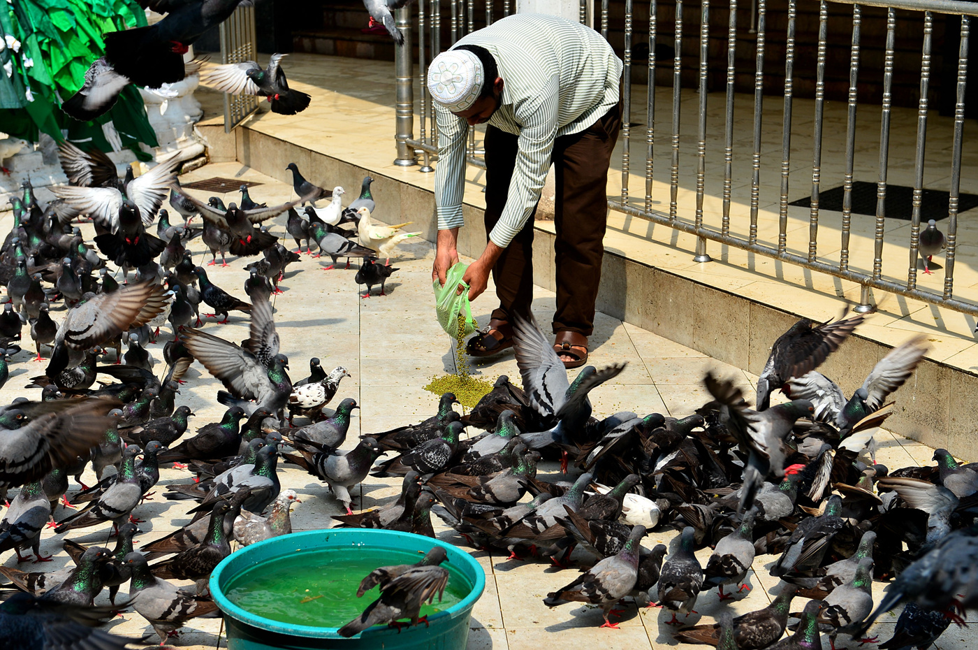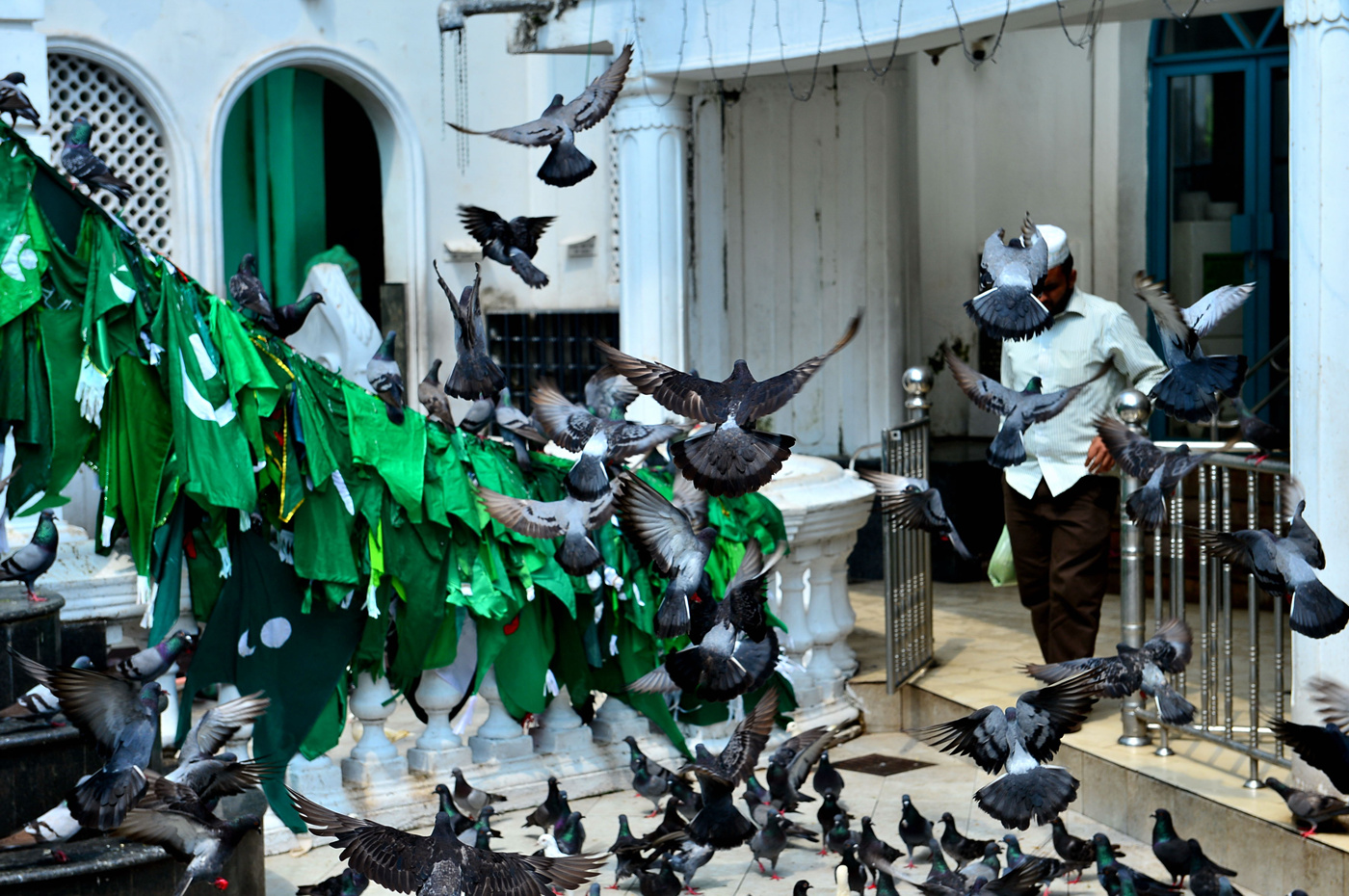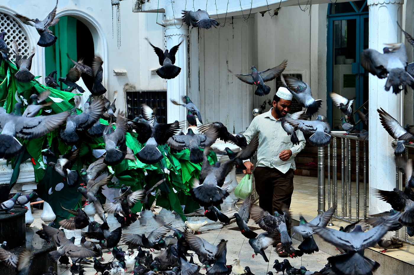 사원 앞 마당의 수많은 비둘기 떼다.