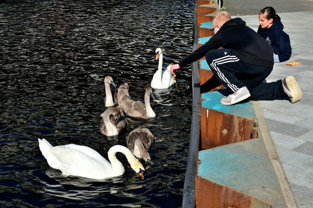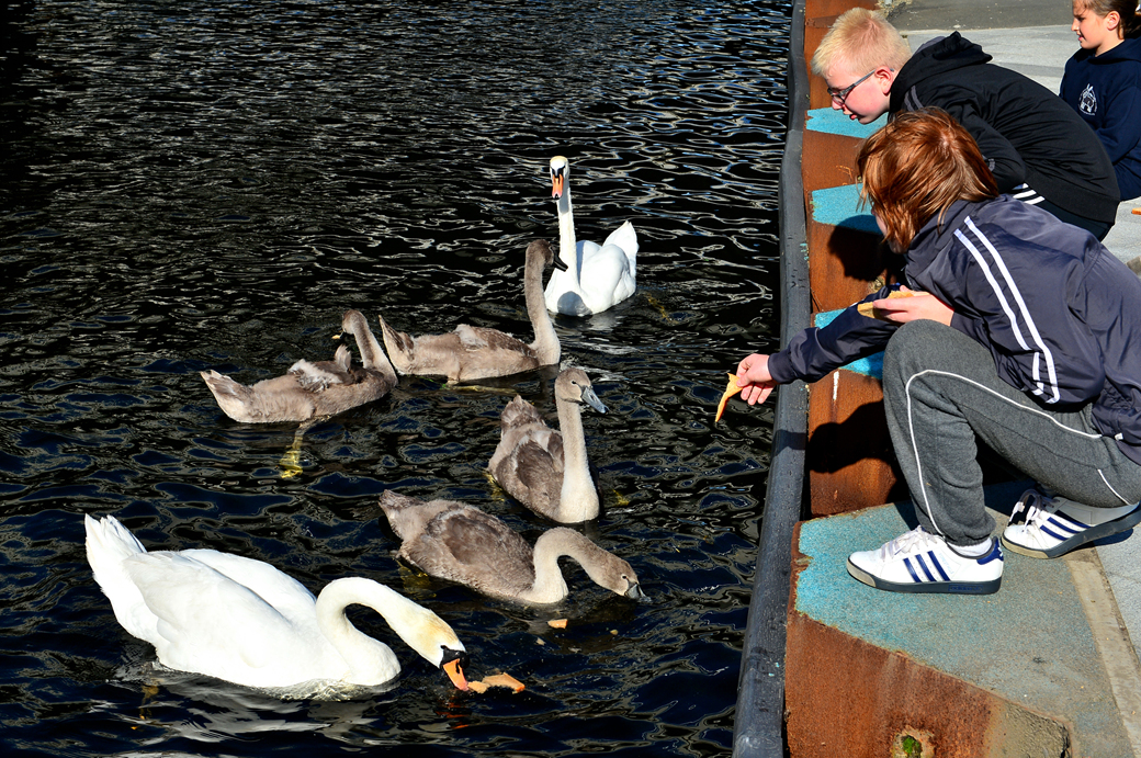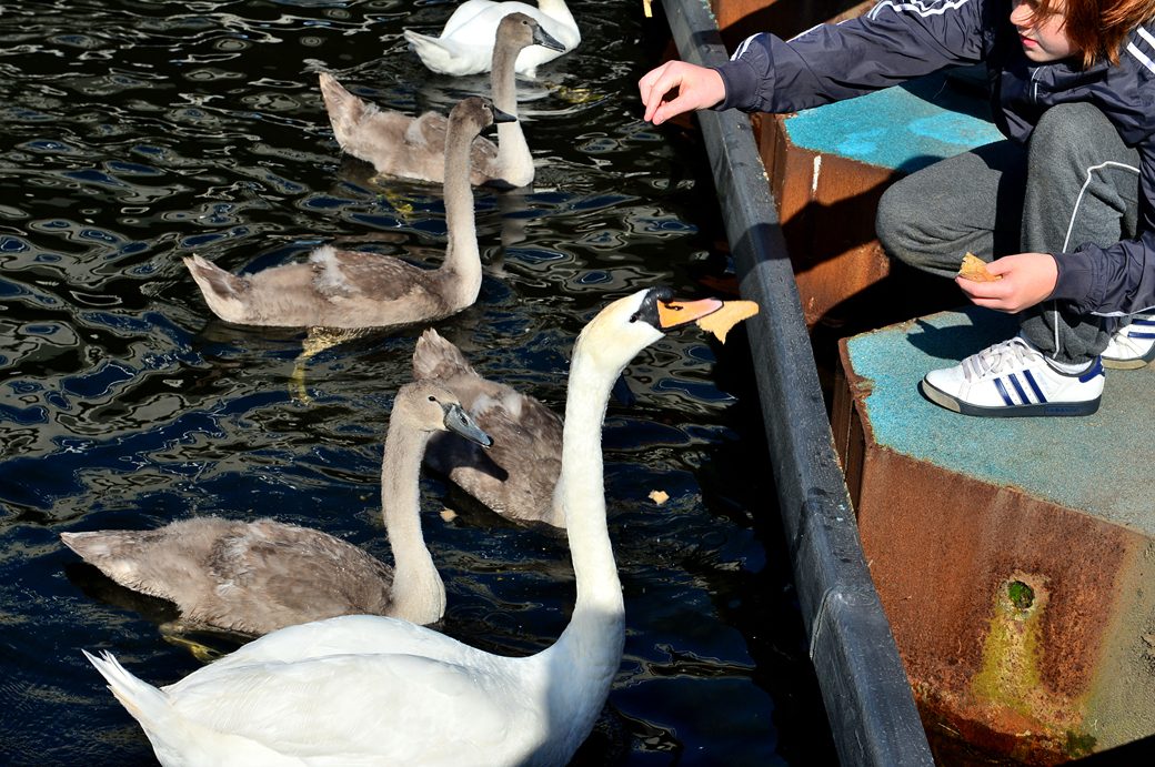 운하에는 오리들도 있는데 아이들이 이 오리들에게 먹이를 주며 즐기고 있다.