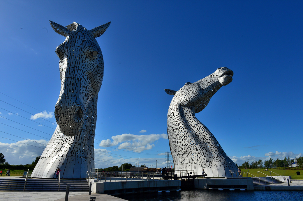 스코틀랜드 운하 Forth & Clyde의 "The Kelpies"라는 이 2 개의 거대한 말머리 조각상은