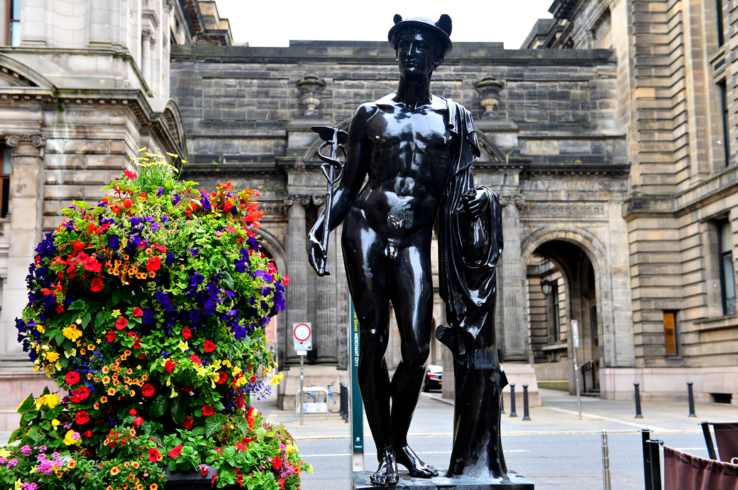 주황색 고깔 모자를 쓴 기마상이 전면에 있는 이 건물은 글래스고 현대 미술관 Gallery of Modern Art이라고 한다.