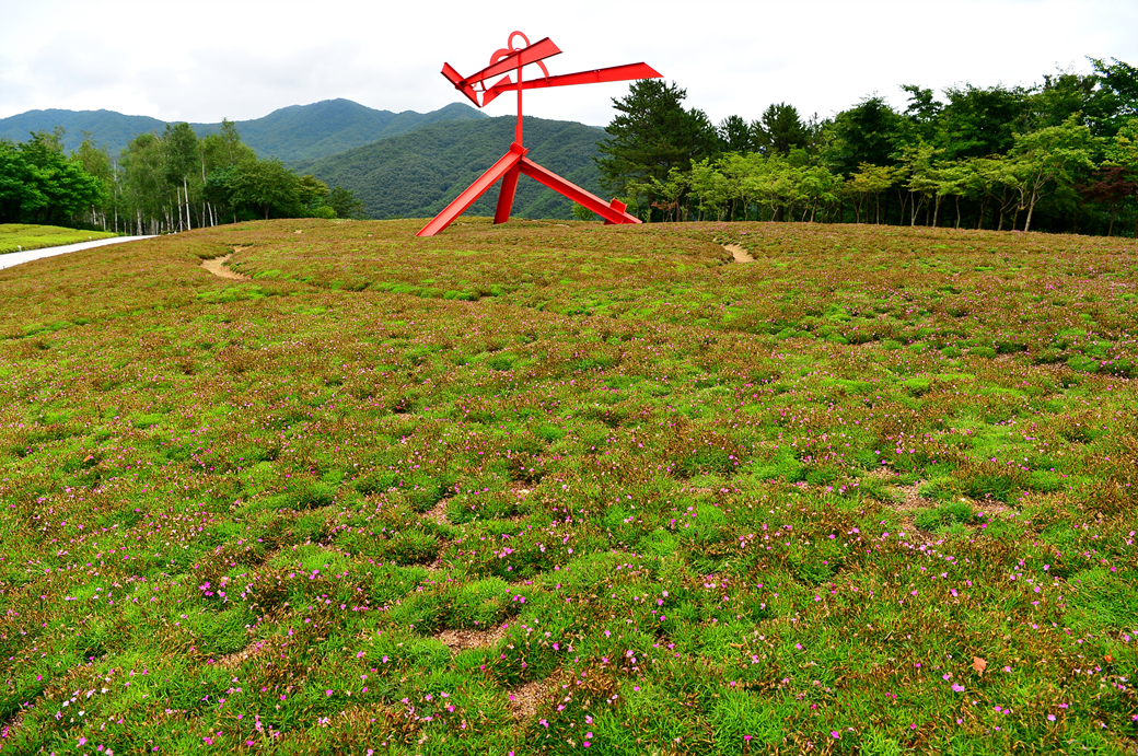 조각 정원 앞의 이곳은 플라워 가든인데 바닥에 피어 있는 꽃은 순수한 사랑이라는 꽃말을 가진 붉은 패랭이 꽃으로