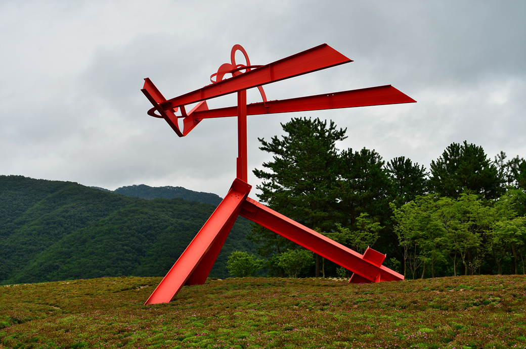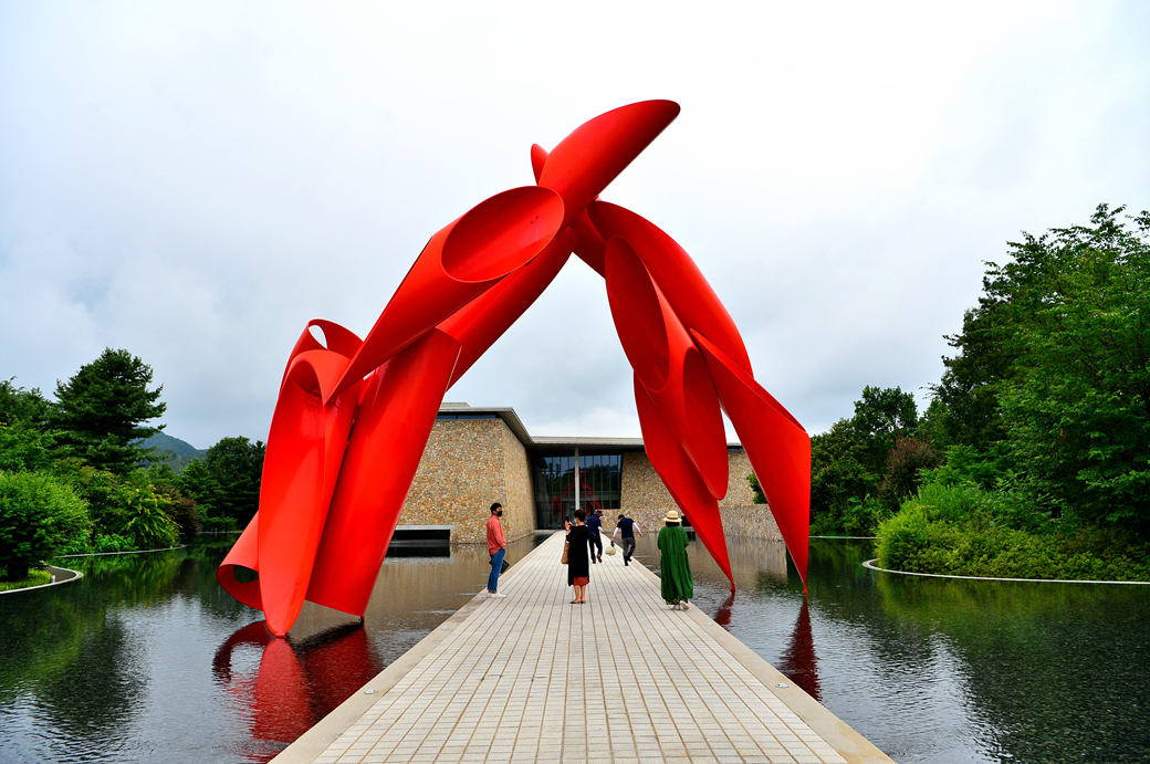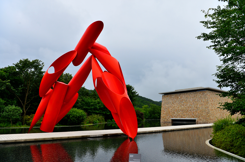 워터 가든에 세워져 있는 인상적인 빨간 조각품~