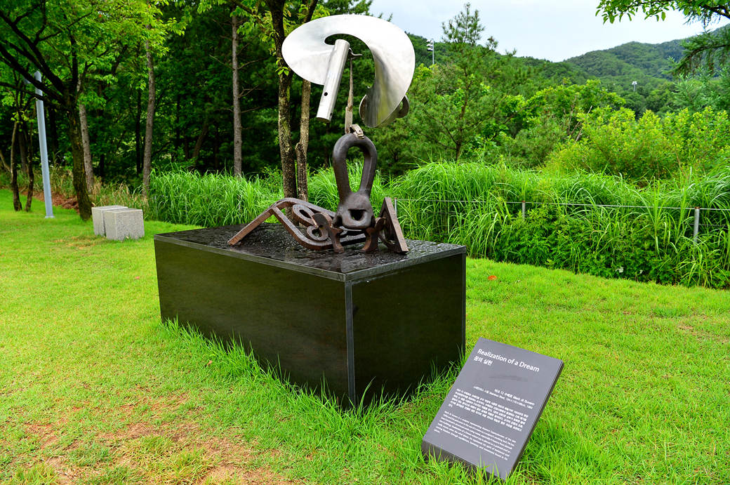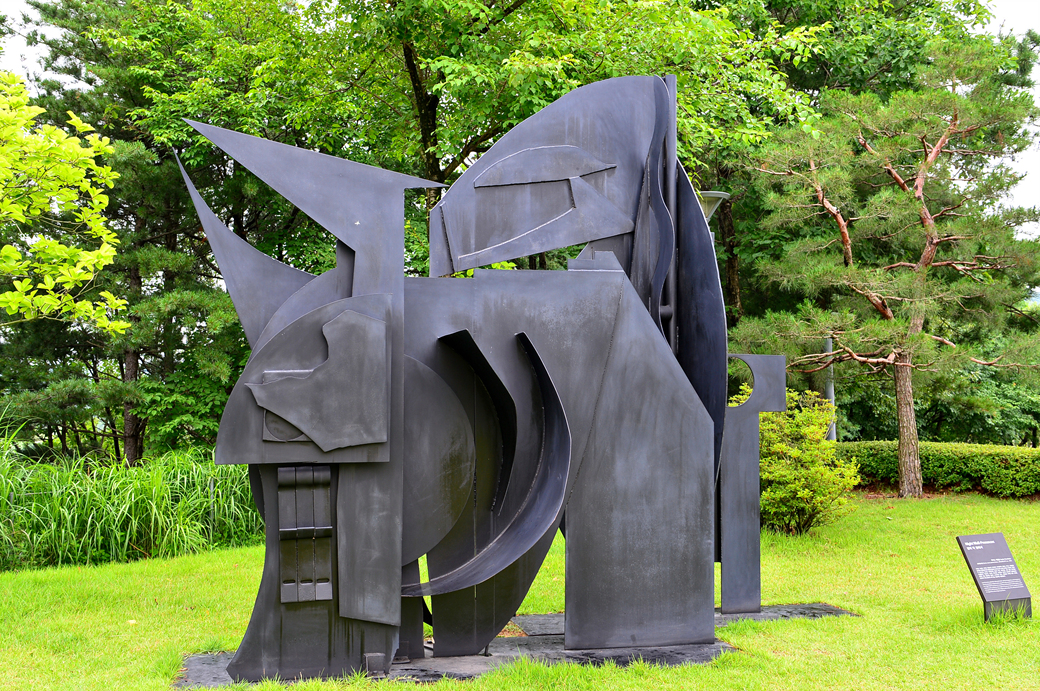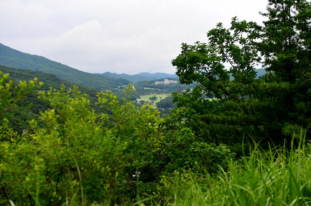조각 정원에서 내려다보이는 풍경인데 산 아래의 푸른 잔디가 보이는 곳은 골프장이다.