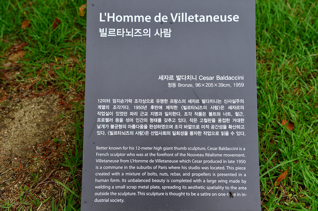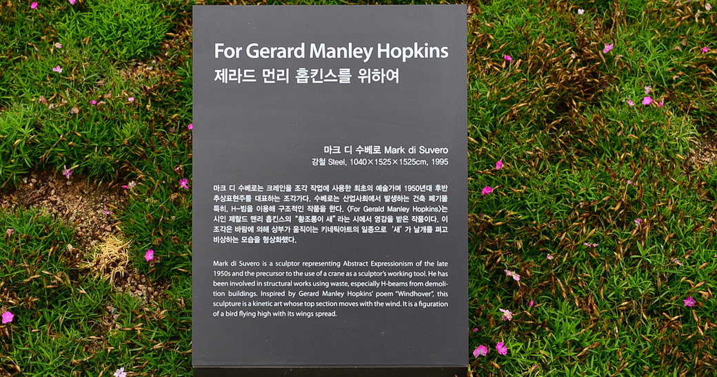 플라워 가든 위에 우뚝 서있는 빨간 철 구조물 작품에 대한 안내판이다.