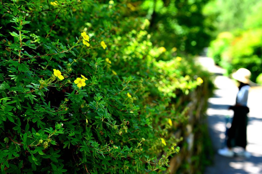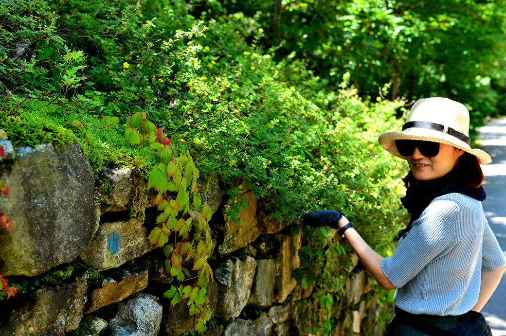 돌담 위에 앙증맞은 자그마한 꽃들이 피어 있는데