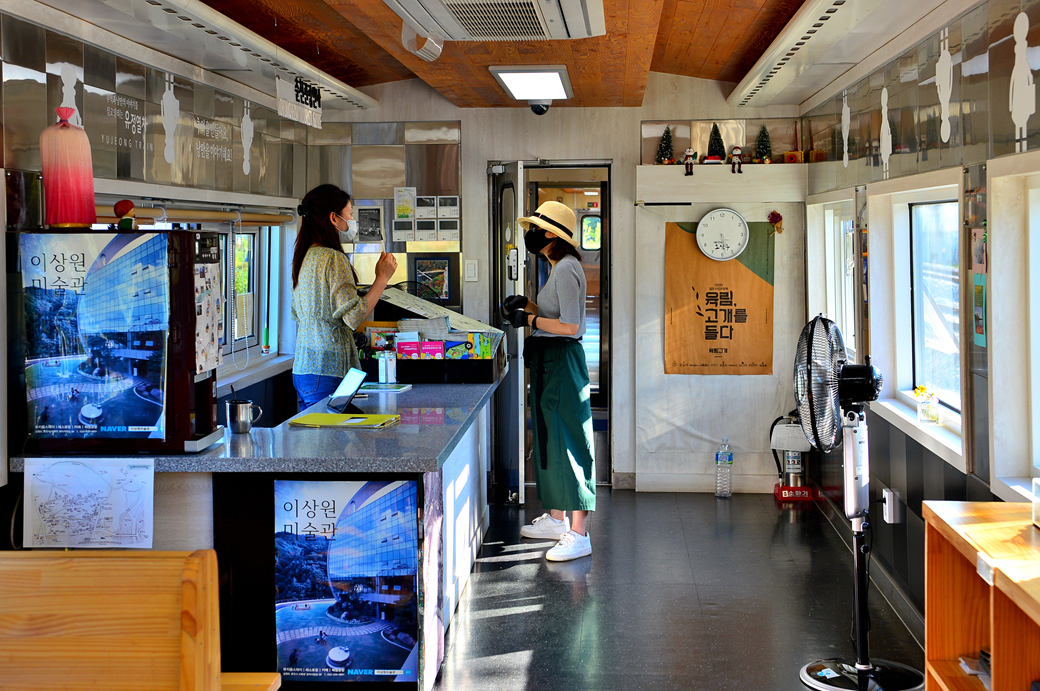 객차 선반에는 많은 책들과 전시물이 놓여 있고