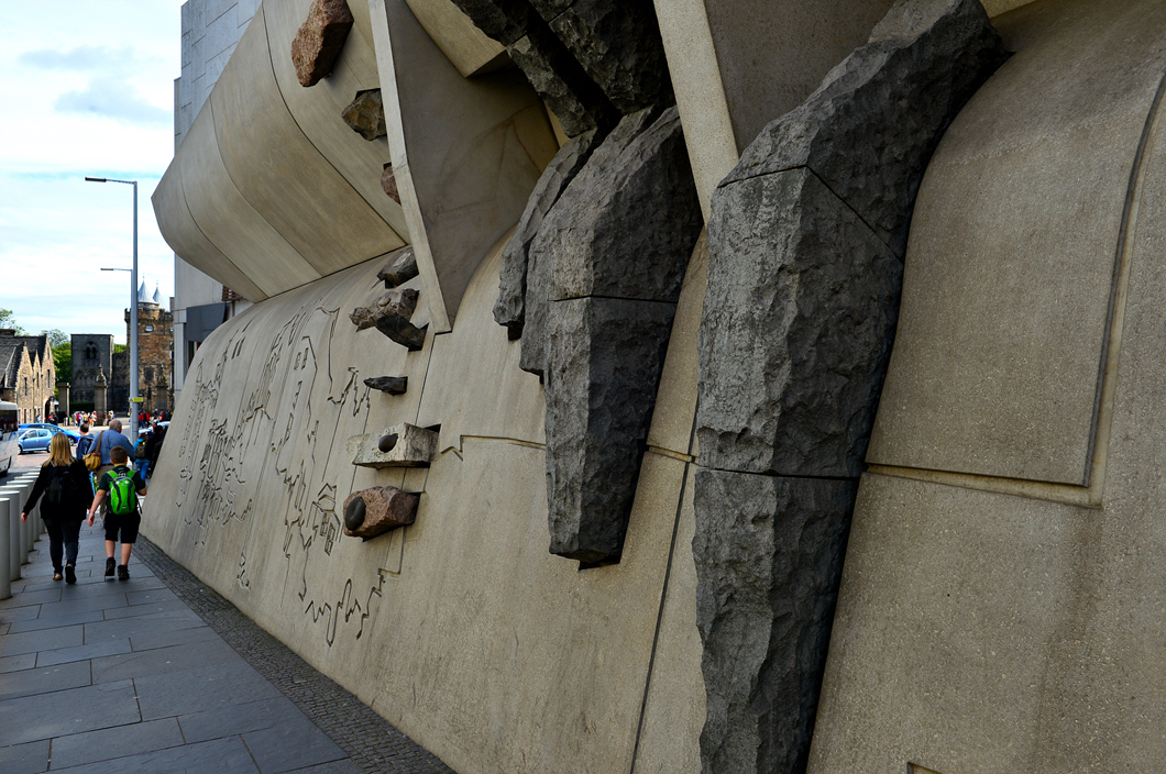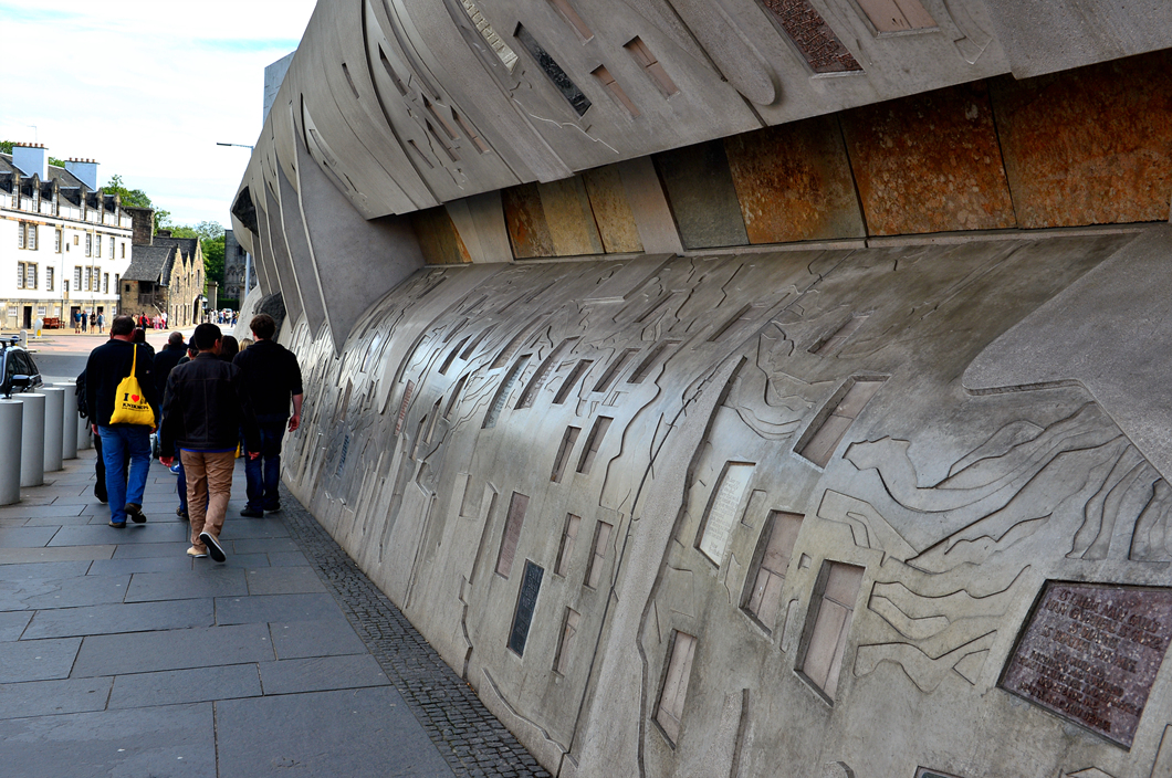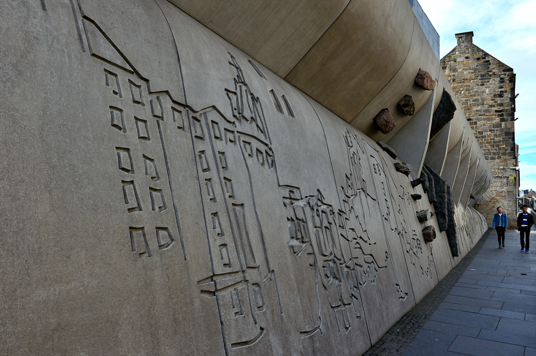 도로와 면한 한쪽 벽면을 독특한 콘크리트로 마감한 이 스코틀랜드 국회 건물은 계획 당시보다 4배 이상의 건축비에