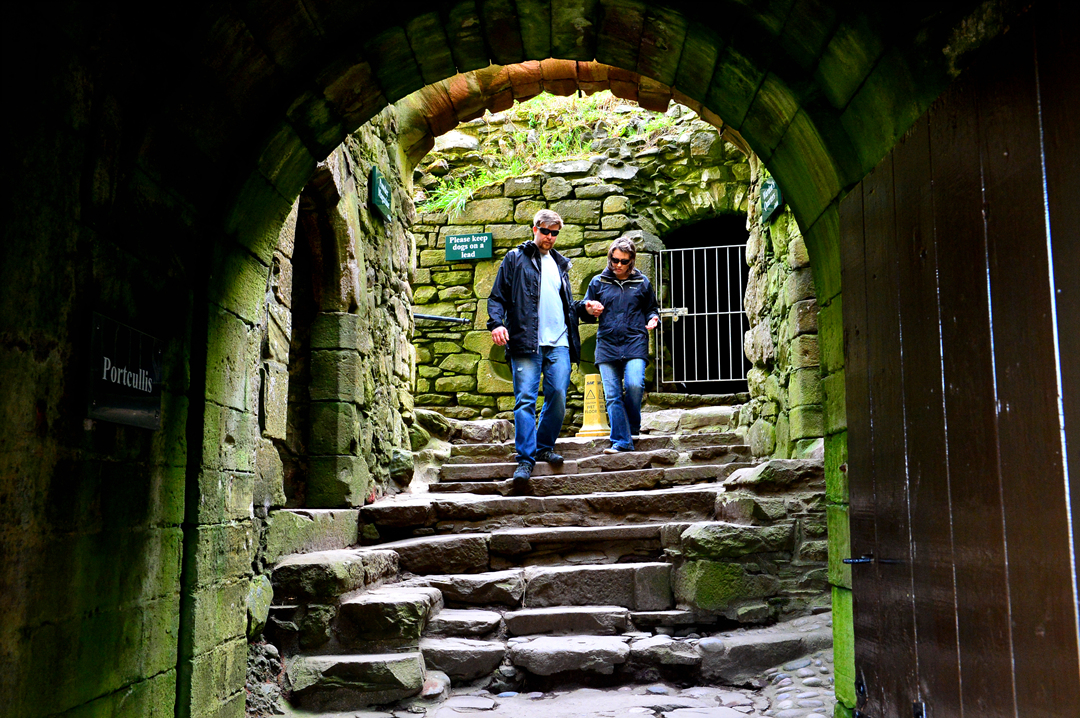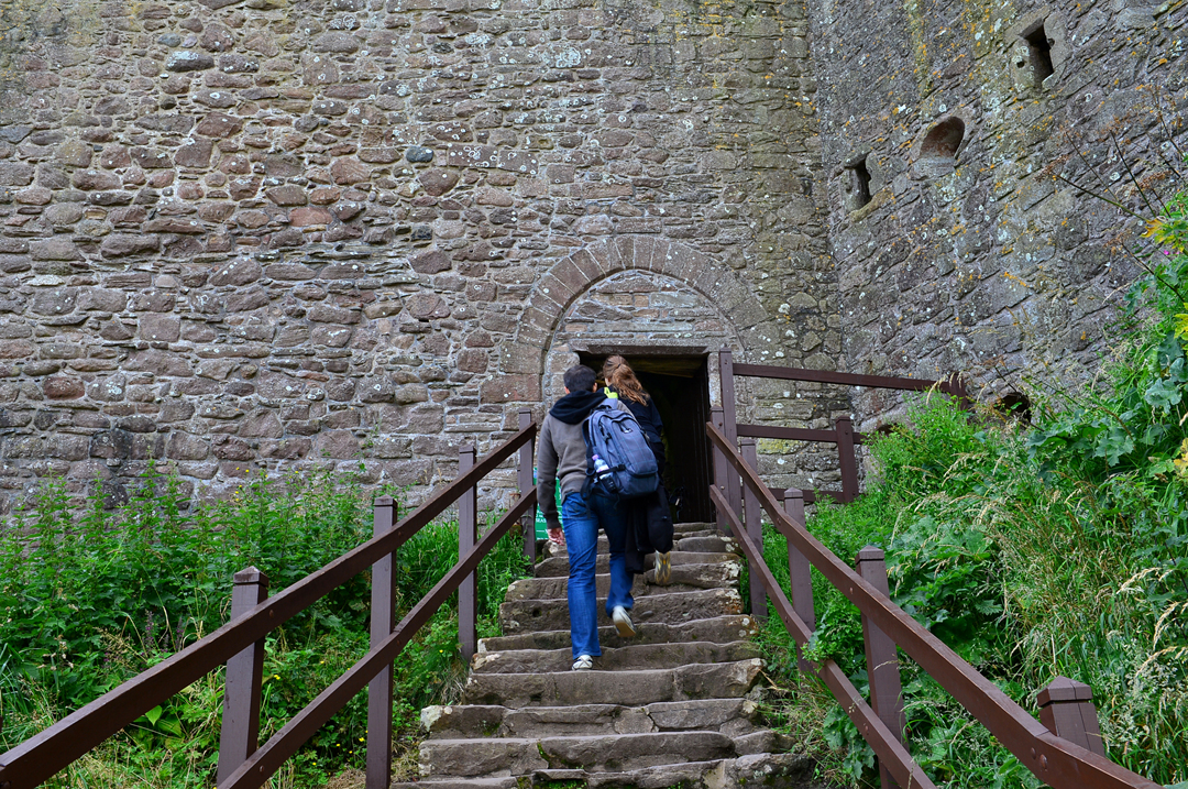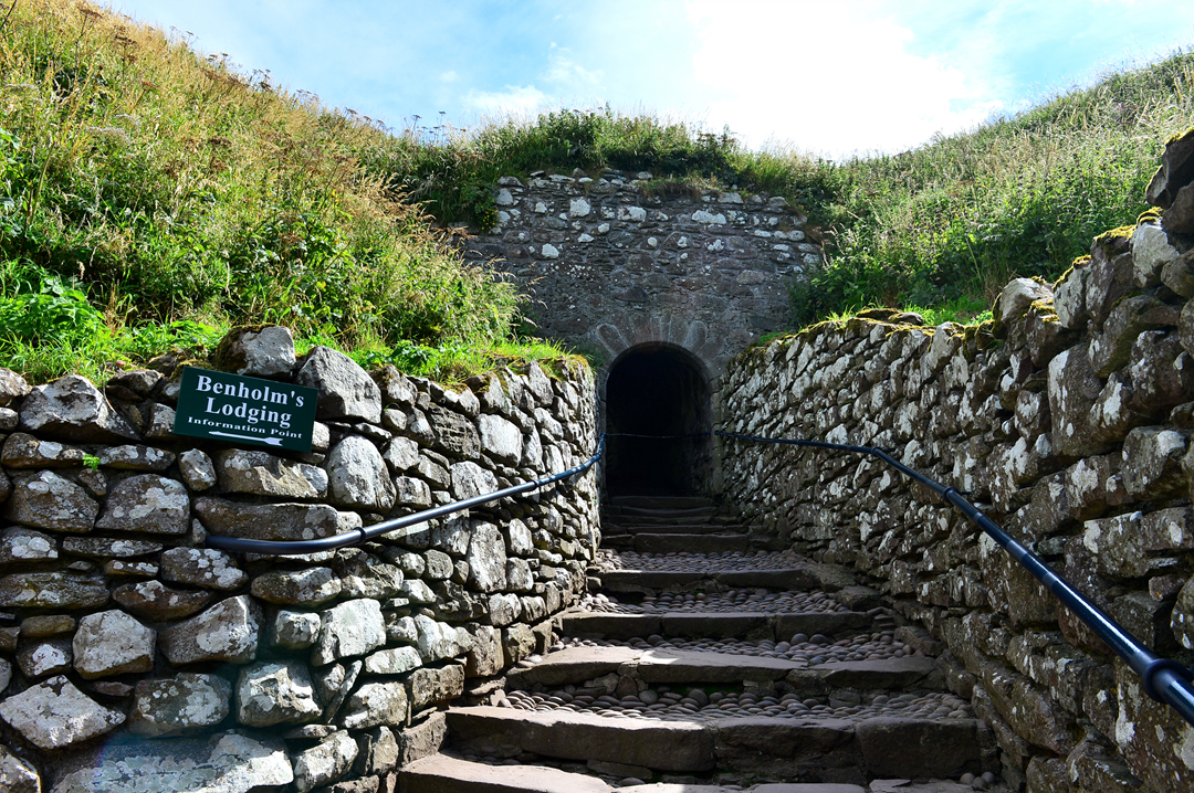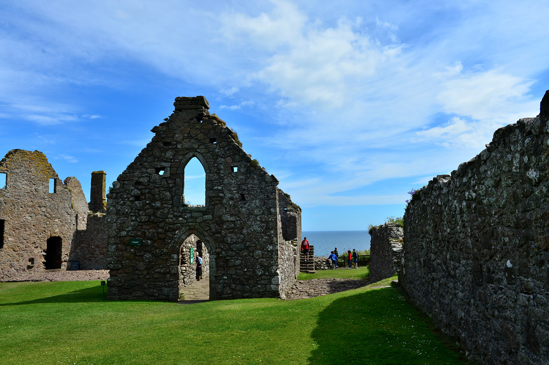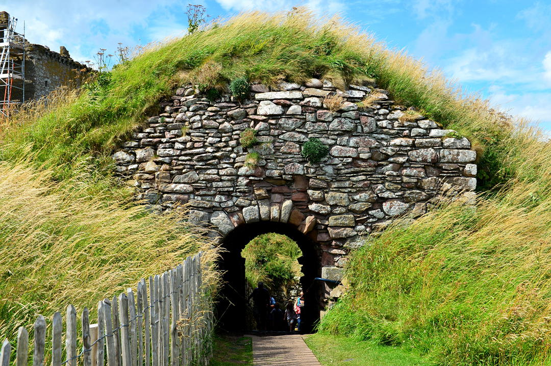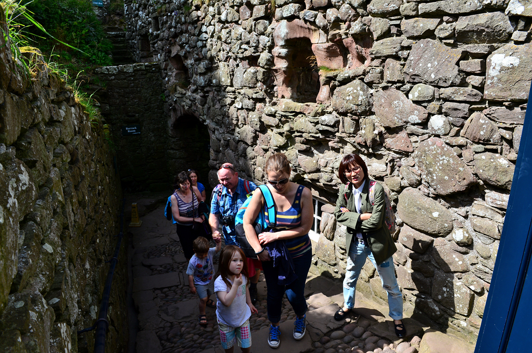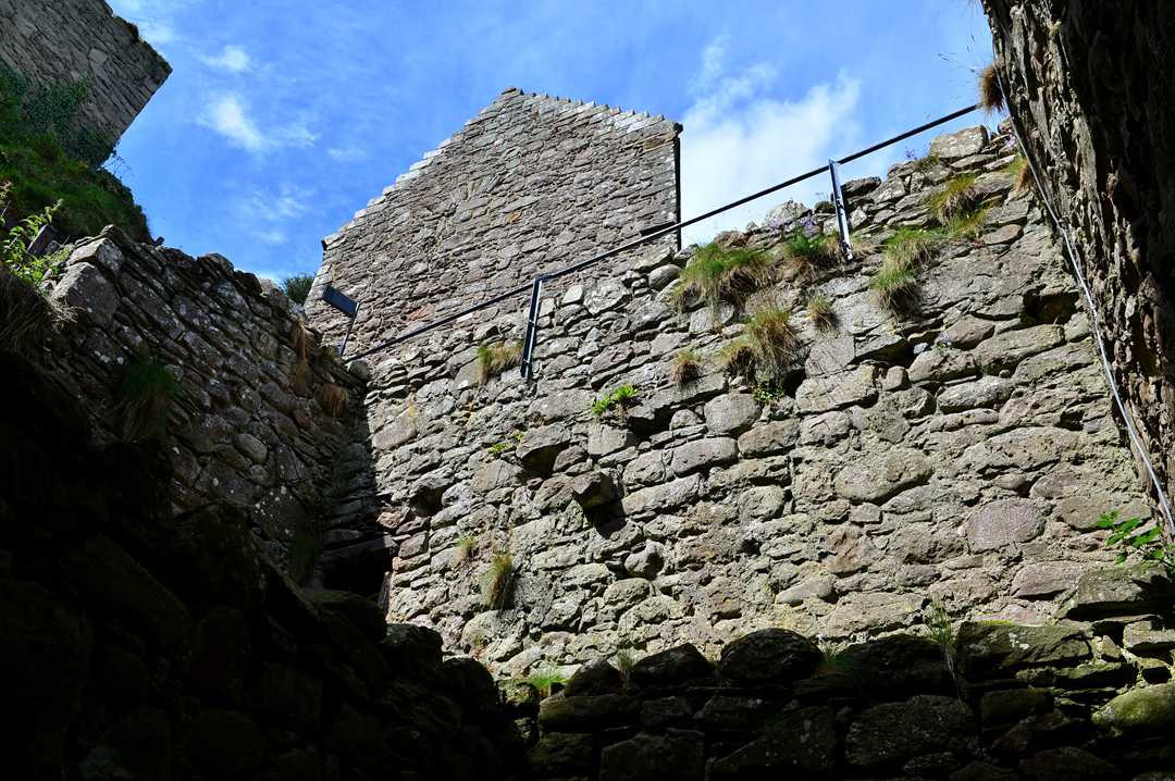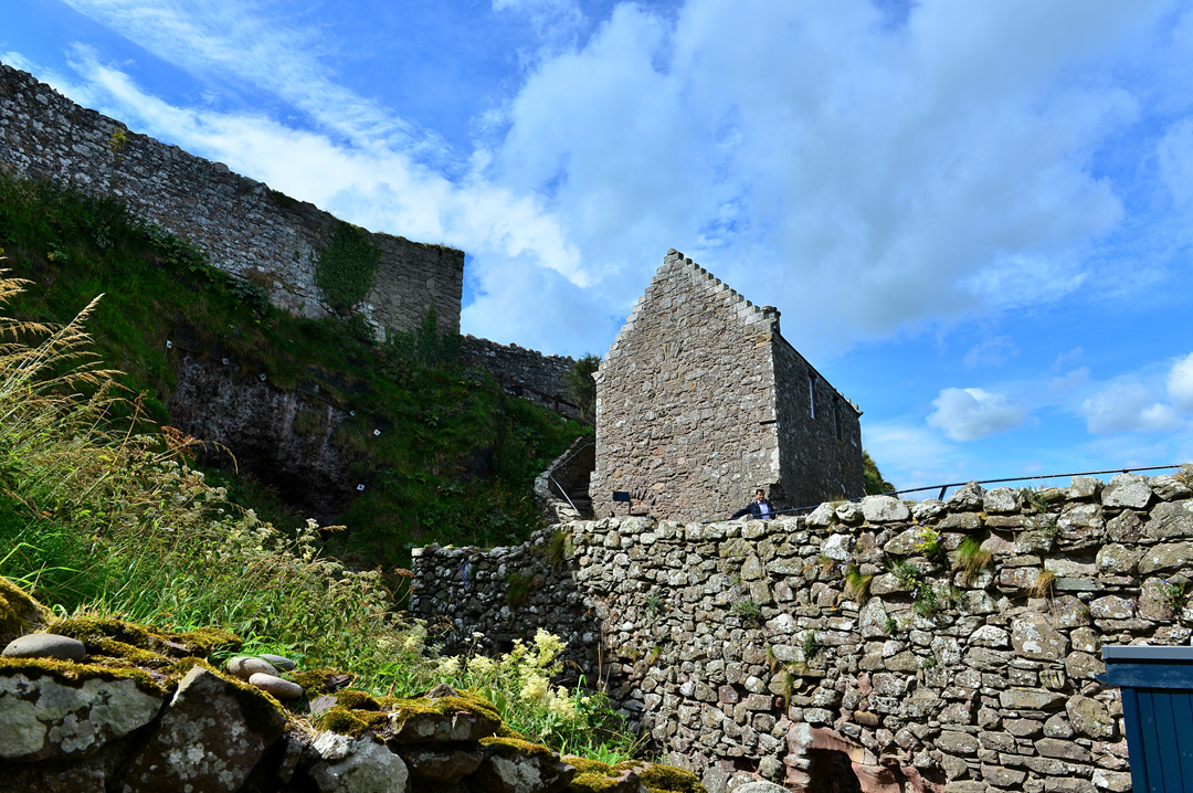 수 세기 동안 바이킹, 잉글랜드의 침략으로 지금은 외관만 남은 성의 건물들 모습이 보인다.