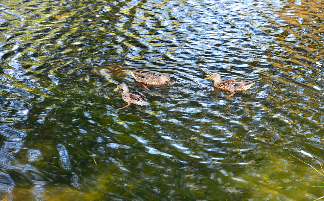 연못에서는 오리들이 한가로이 노닐고 있다.