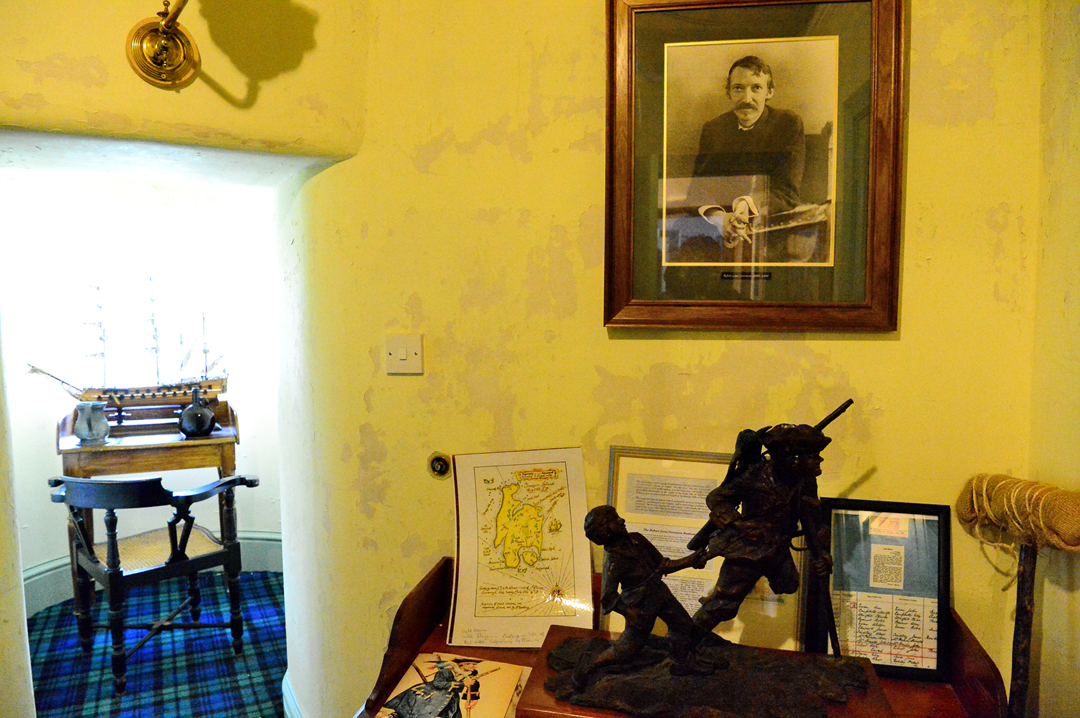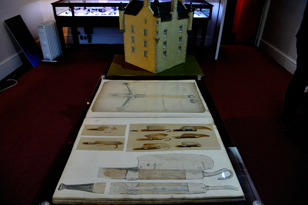 스코틀랜드 국기가 새겨진 가문의 휘장과 함께 의상과 칼 등 소품들이 전시되어 있다.
