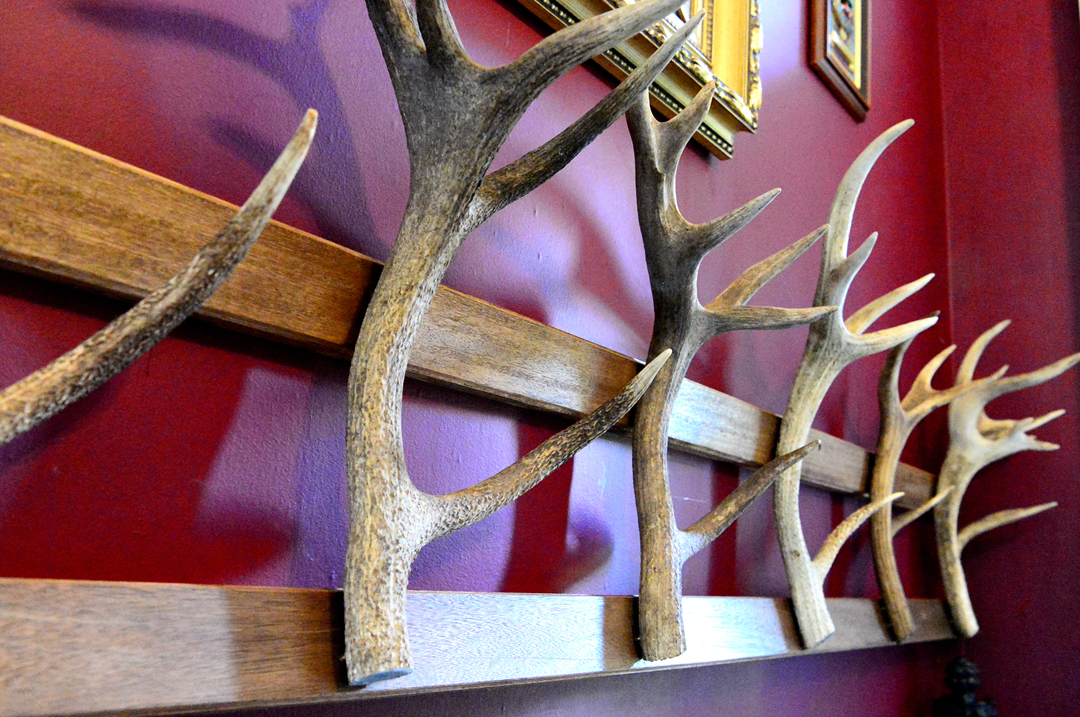 벽에는 사슴뿔이 잔뜩 걸려 있다.