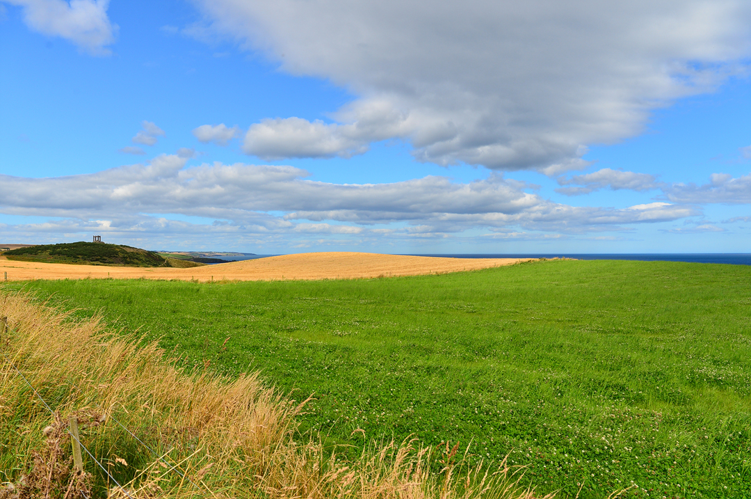 바닷가 언덕 위의 자그마한 구조물은 던노타 캐슬과 바닷가 아름다운 마을인 스톤헤이븐