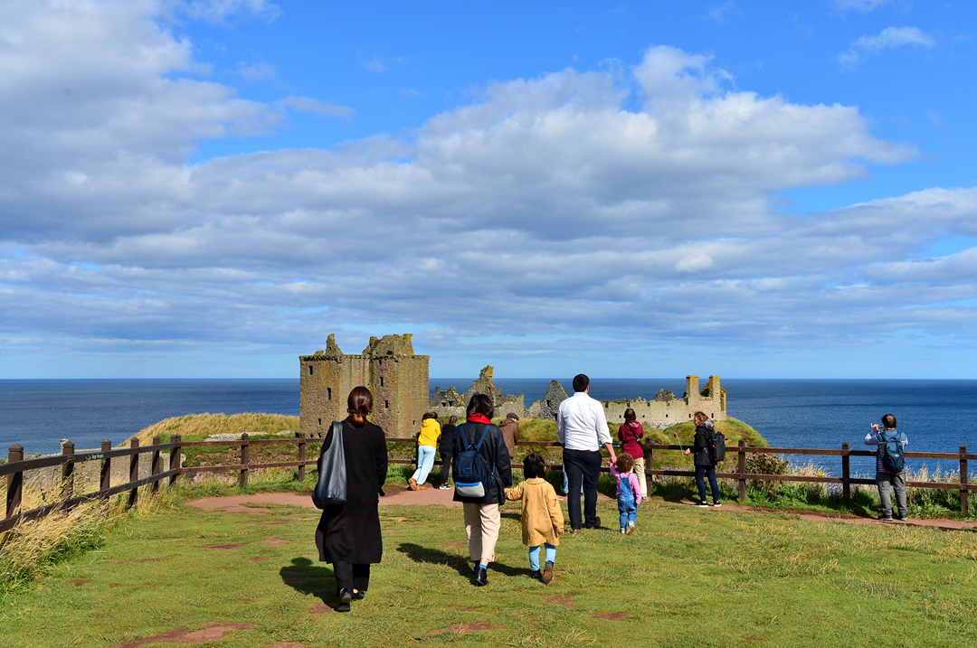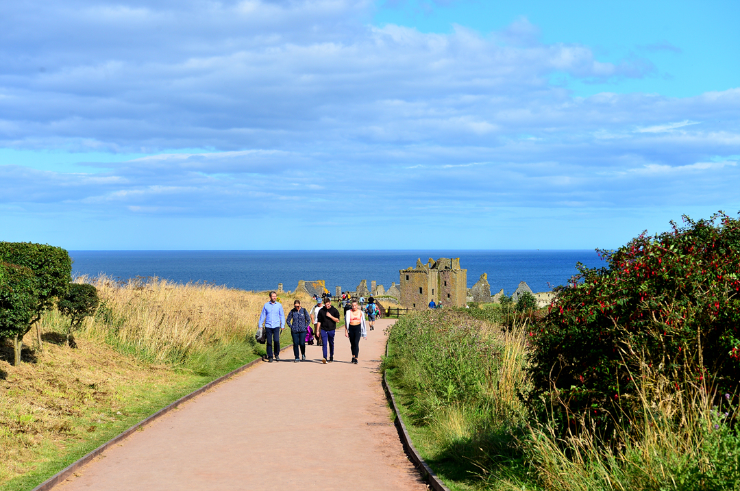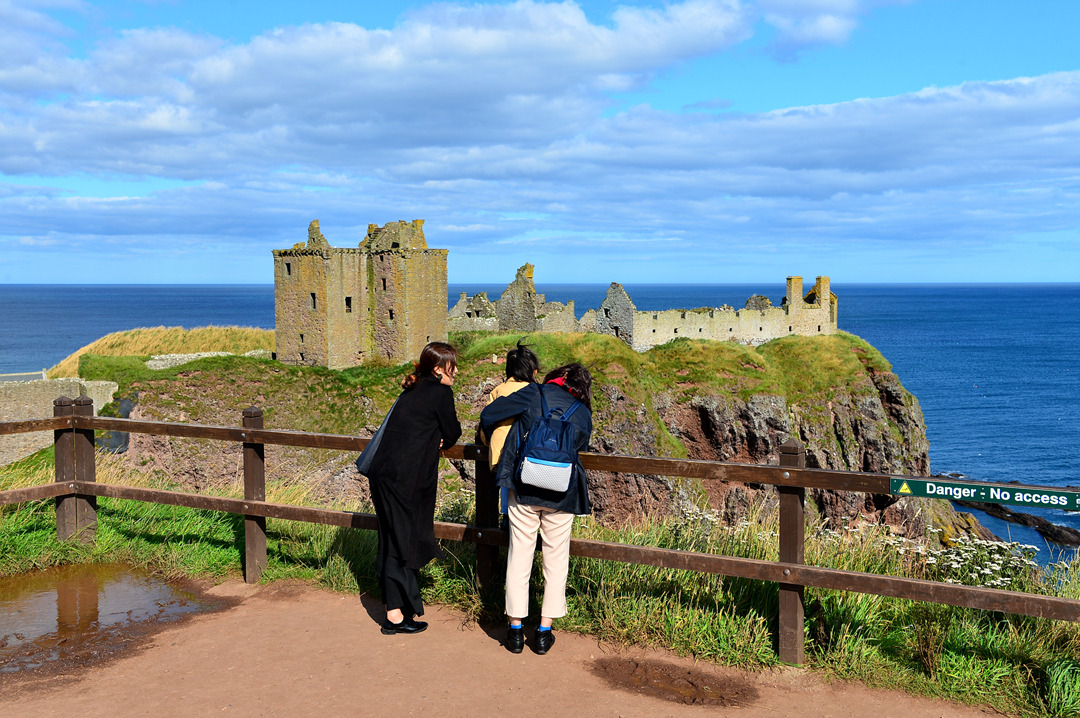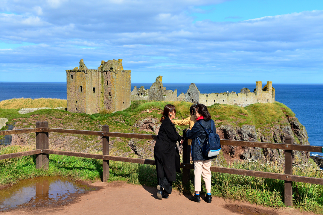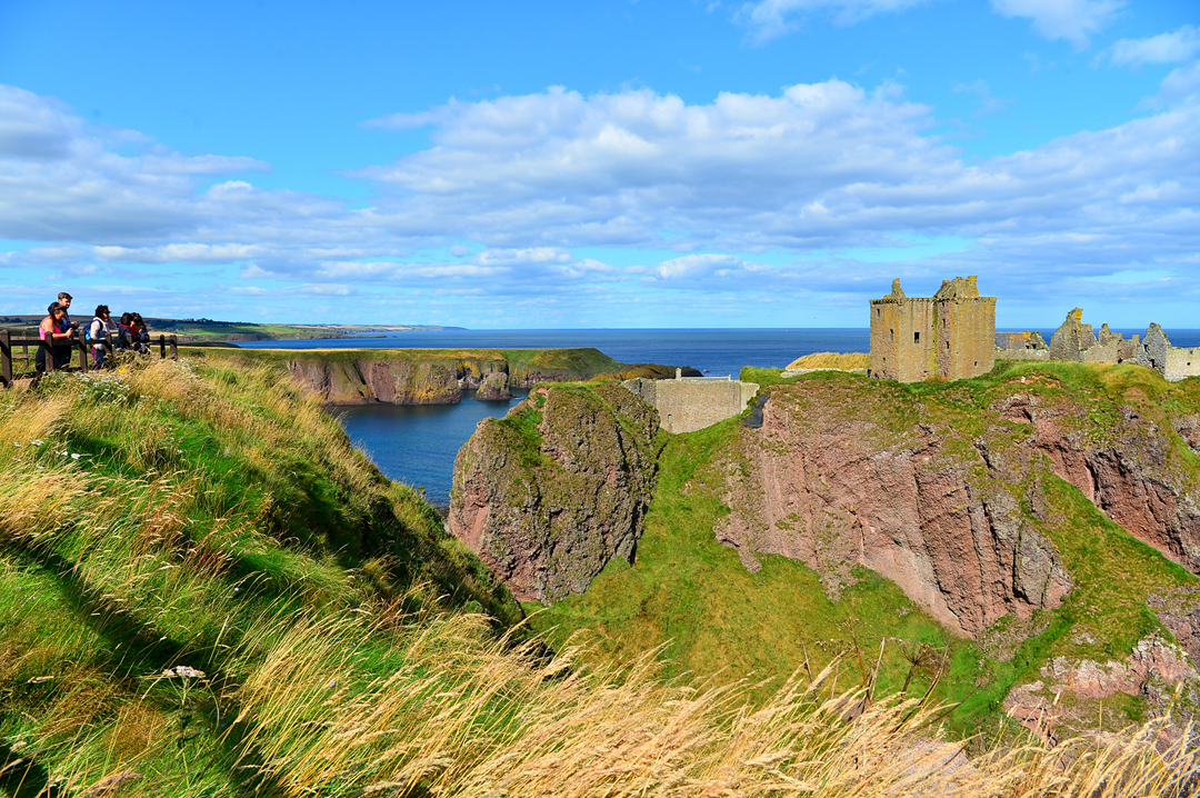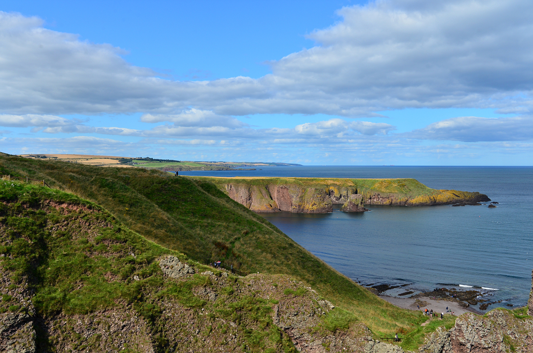 푸른 초지 너머 바닷가 길을 걷는 사람들 모습이 보이는데, 이들은 던노타 캐슬에서