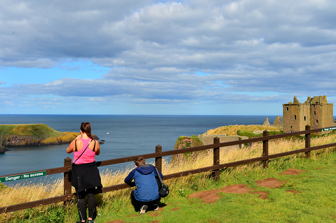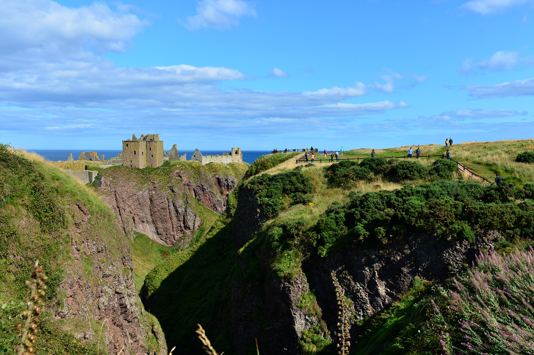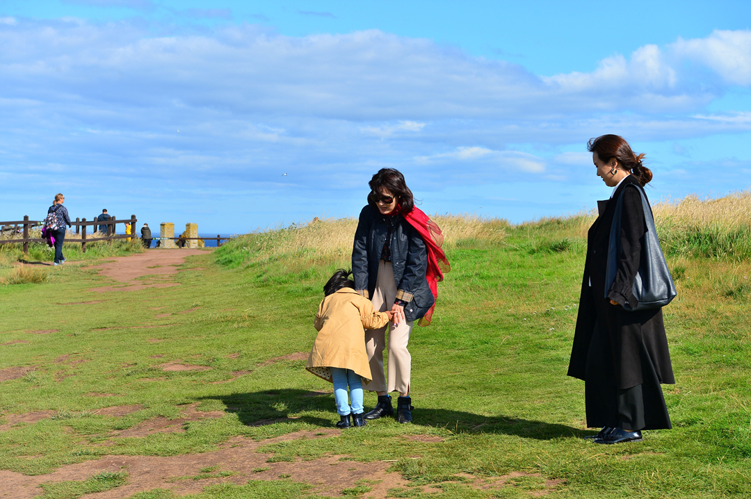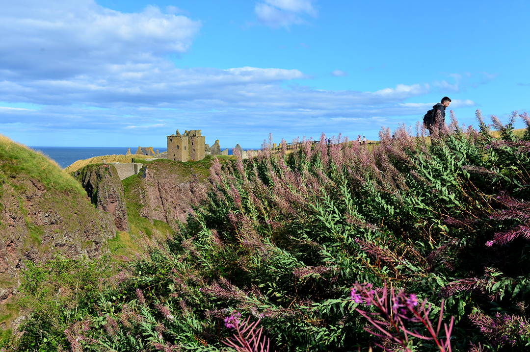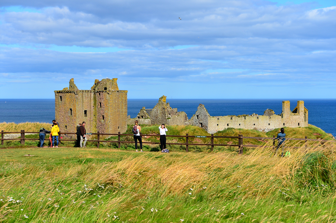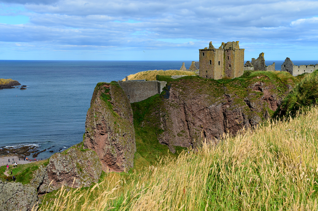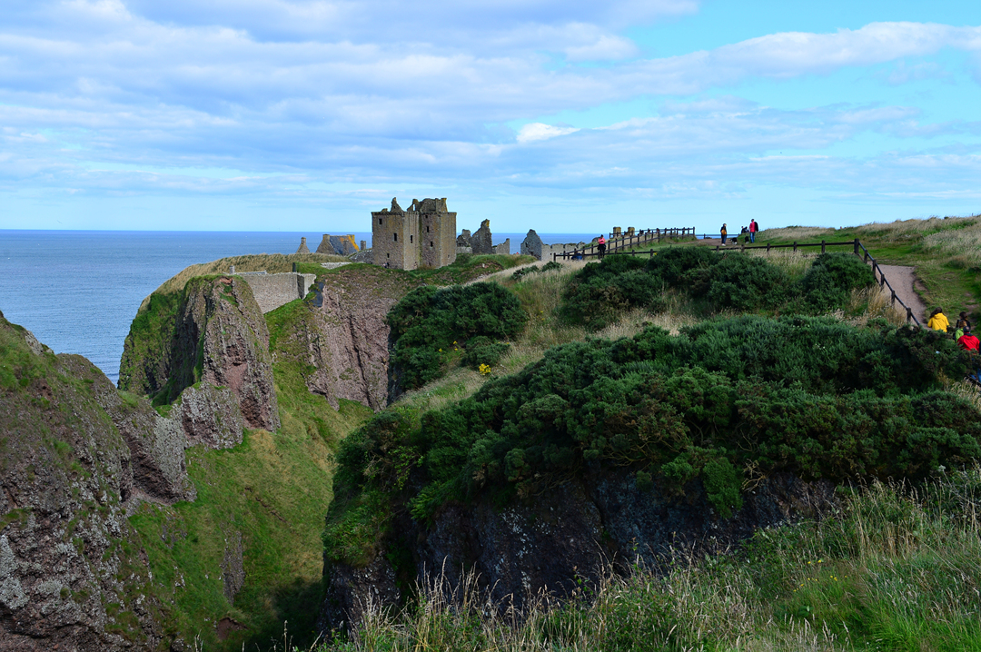푸른 초지 너머 바닷가 길을 걷는 사람들 모습이 보이는데, 이들은 던노타 캐슬에서