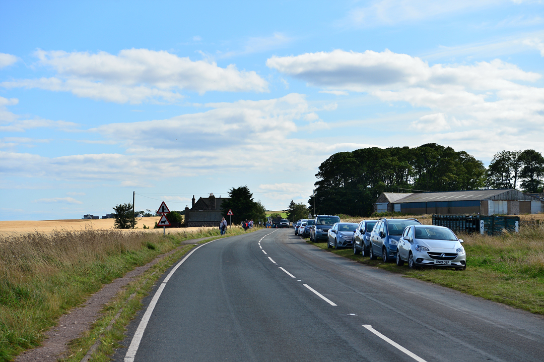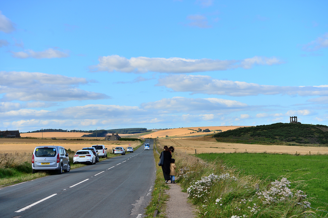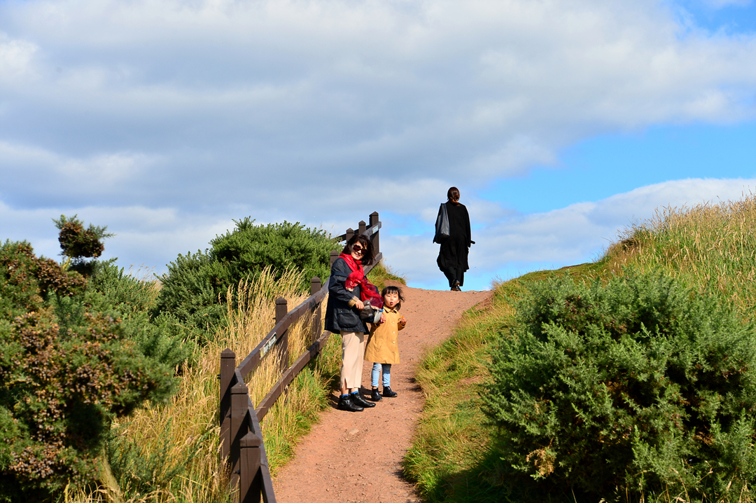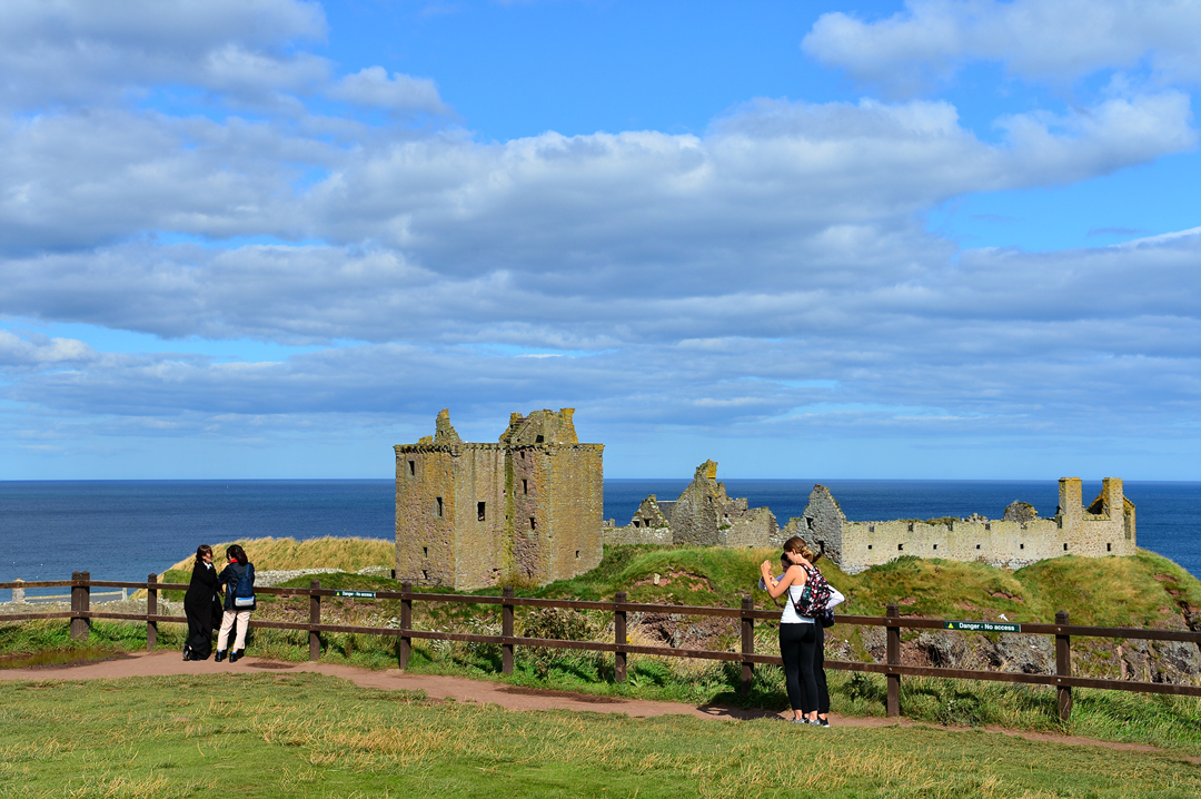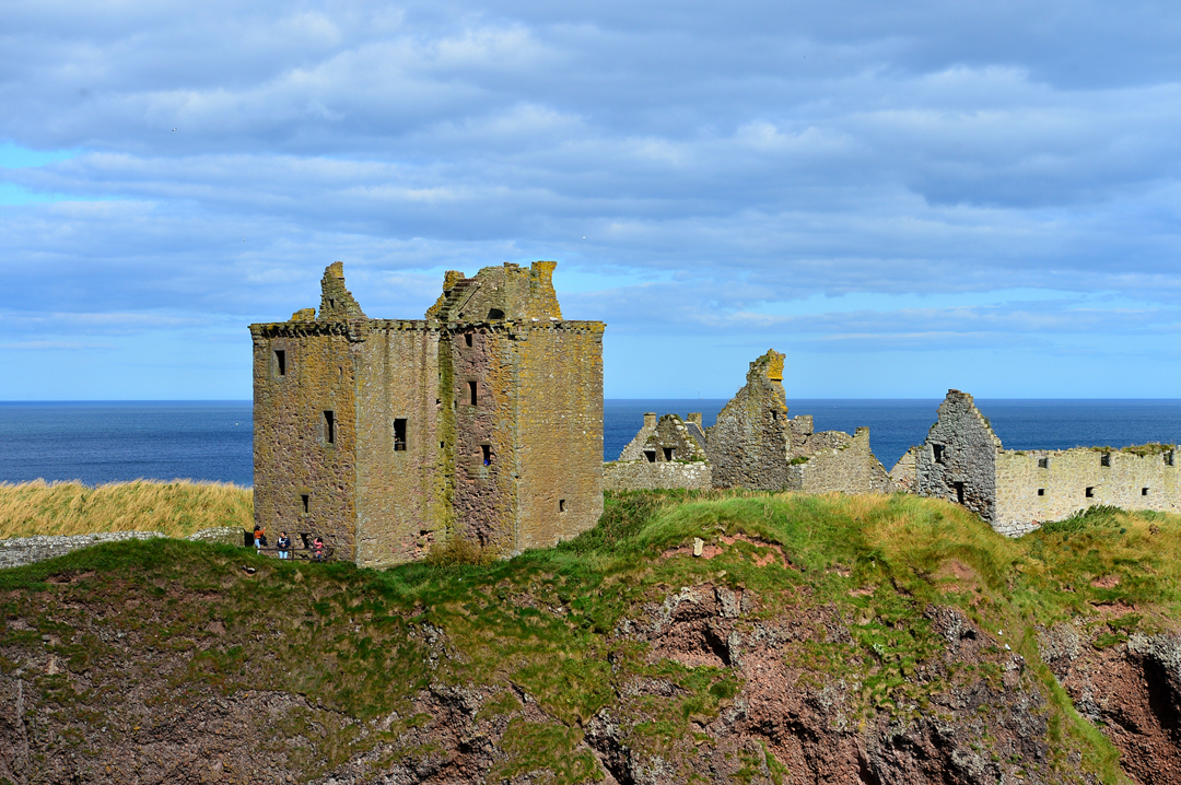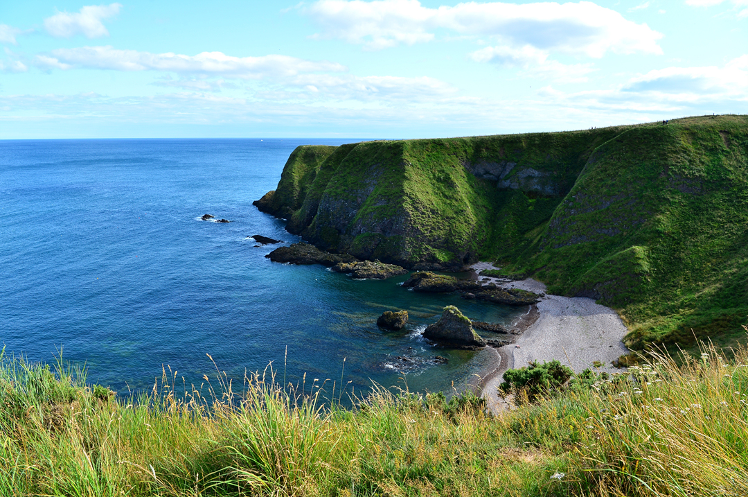 푸른 초지 너머 바닷가 길을 걷는 사람들 모습이 보이는데, 이들은 던노타 캐슬에서