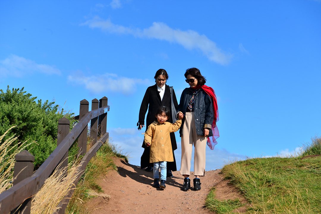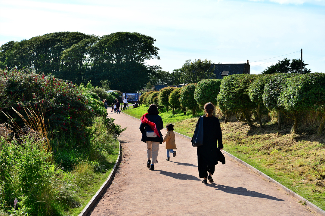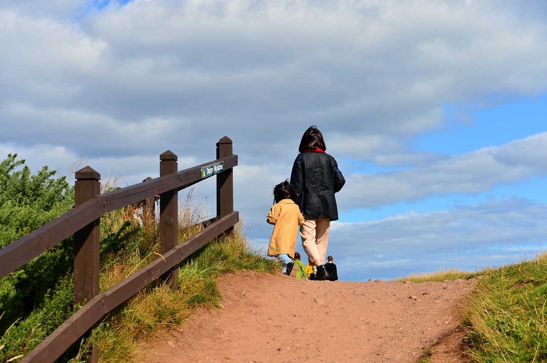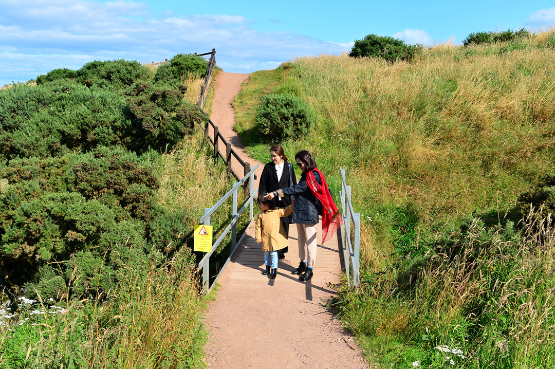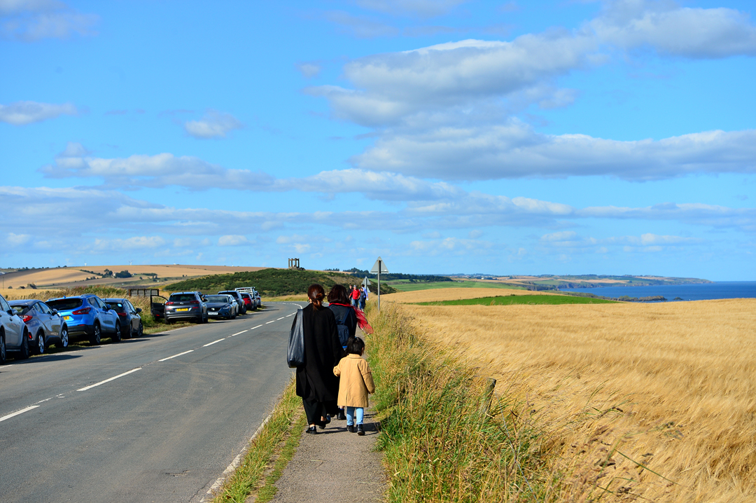 전쟁 기념물 Stonehaven War Memorial로 이어지는 산책길 던노타 트레일을 걷는 사람들이다.