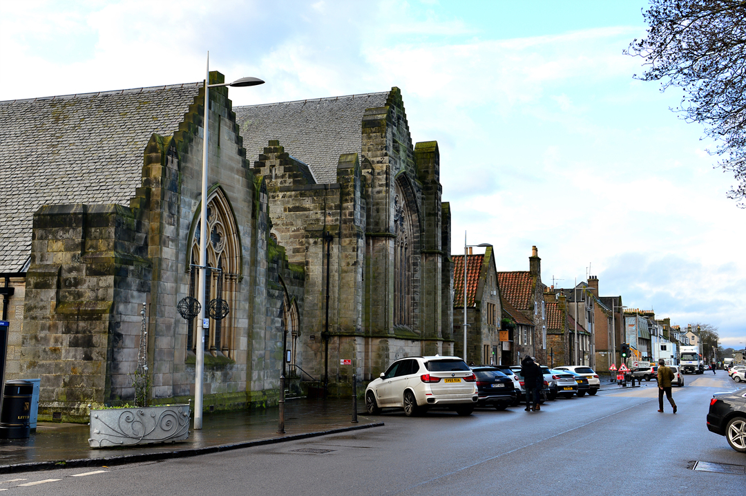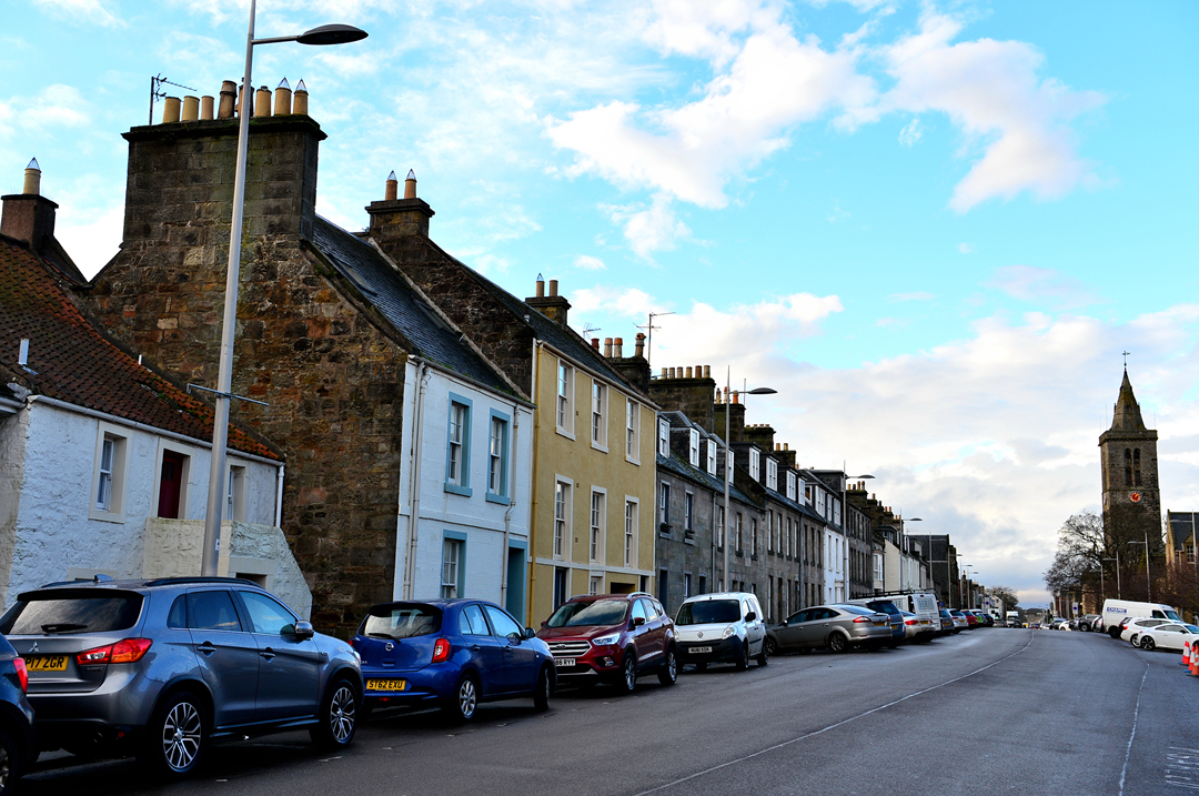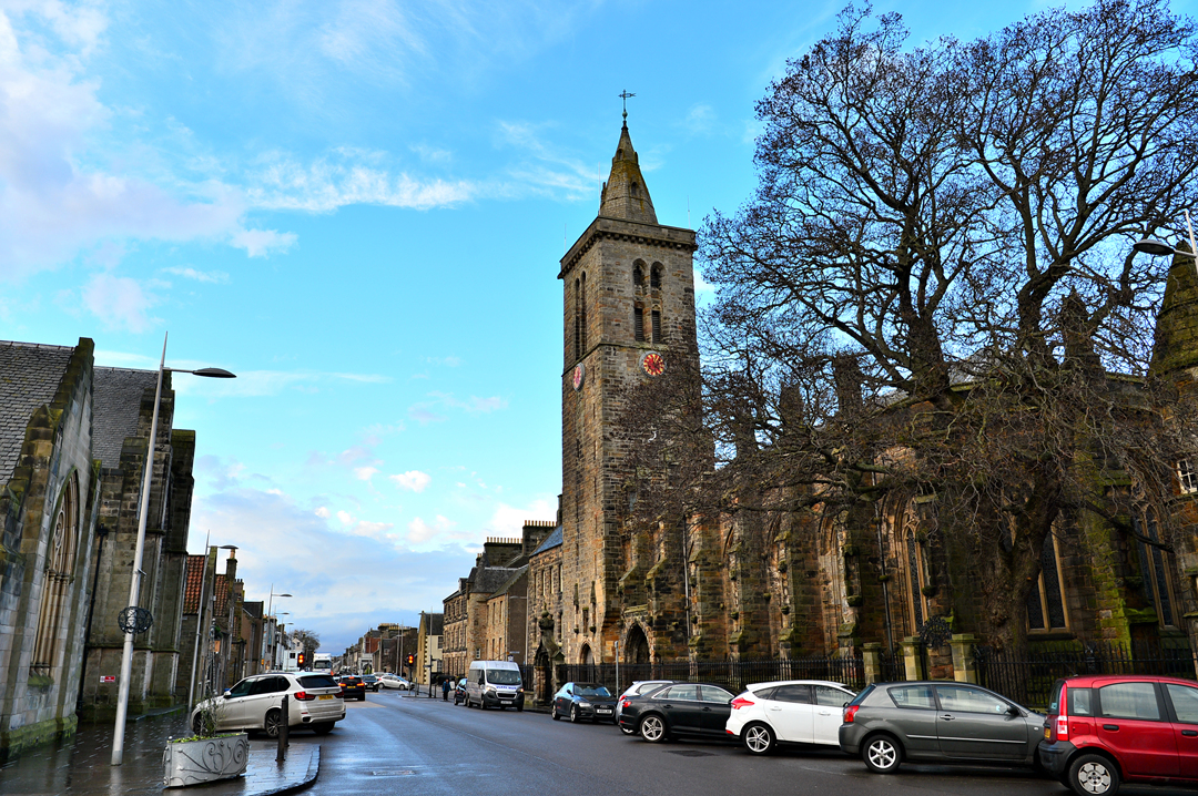 거리의 끝에서 세인트 앤드루스 성당 St Andrews Cathedral의 종탑이 보인다.