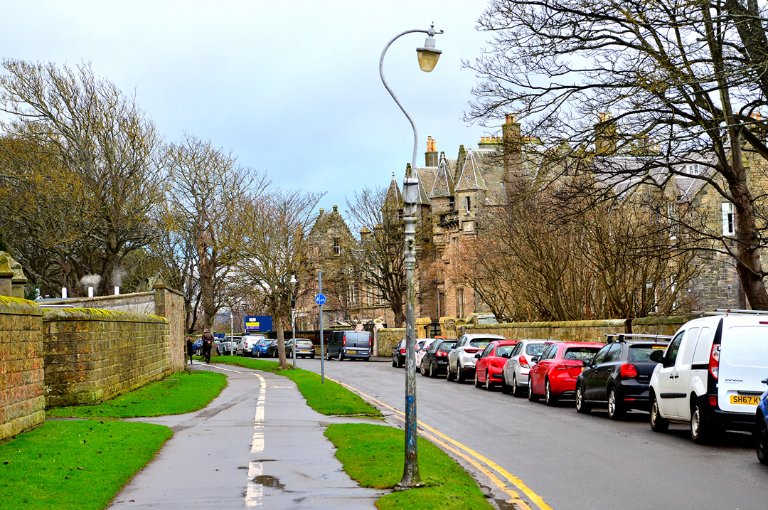 담장으로 둘러싸인 거리 반대편 건물들은 세인트 앤드루스 대학교 University of St Andrews라고 한다.