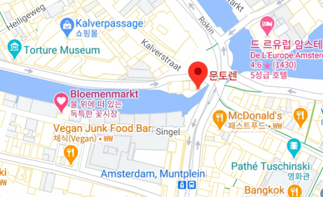 문트 탑 Munttoren은 로킨과 칼베르 등 7개의 큰 거리가 모이고, 싱겔 운하가 암스테르담 강과