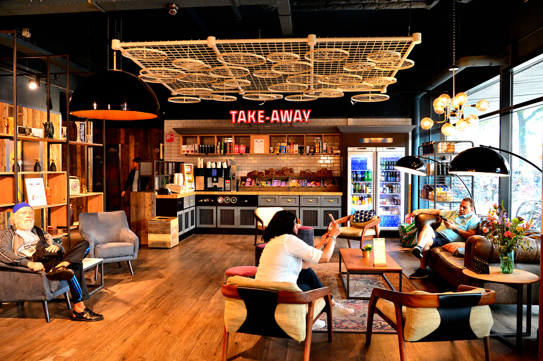 자전거 천국의 호텔답게 자전거 바퀴 모형으로 천장을 장식한 이곳 로비에는