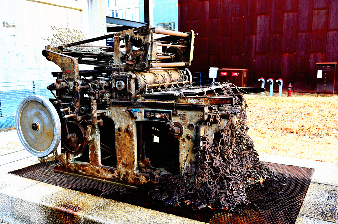 활자를 계속 쏟아내고 있는 녹슬은 윤전기다.