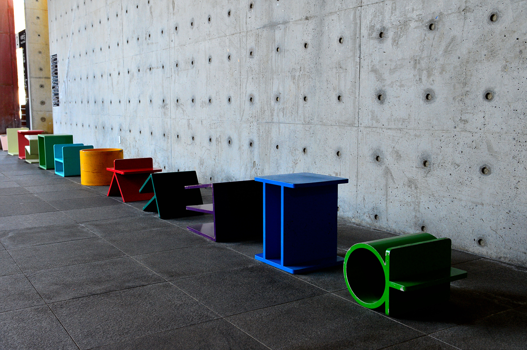 입구에 나란히 놓여 있는 묵직한 철재 의자들~
