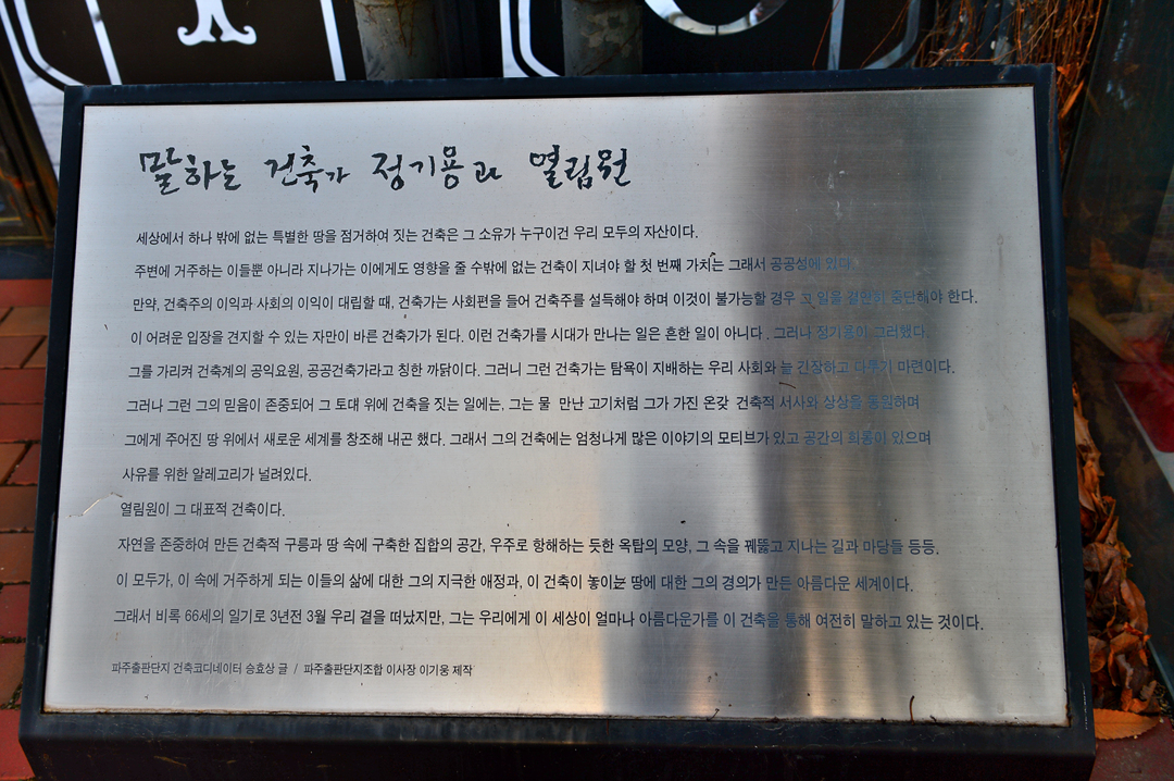 열림원이라는 건물 앞에 세워 놓은 건축가의 생각을 적어 놓은 명판이다.