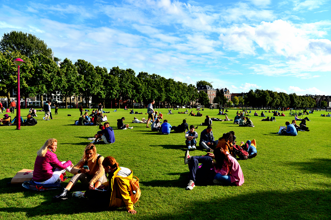 뮤지엄 광장의 넓은 잔디밭 위에서는 많은 사람들이 편안하게 휴식을 취하고 있다.