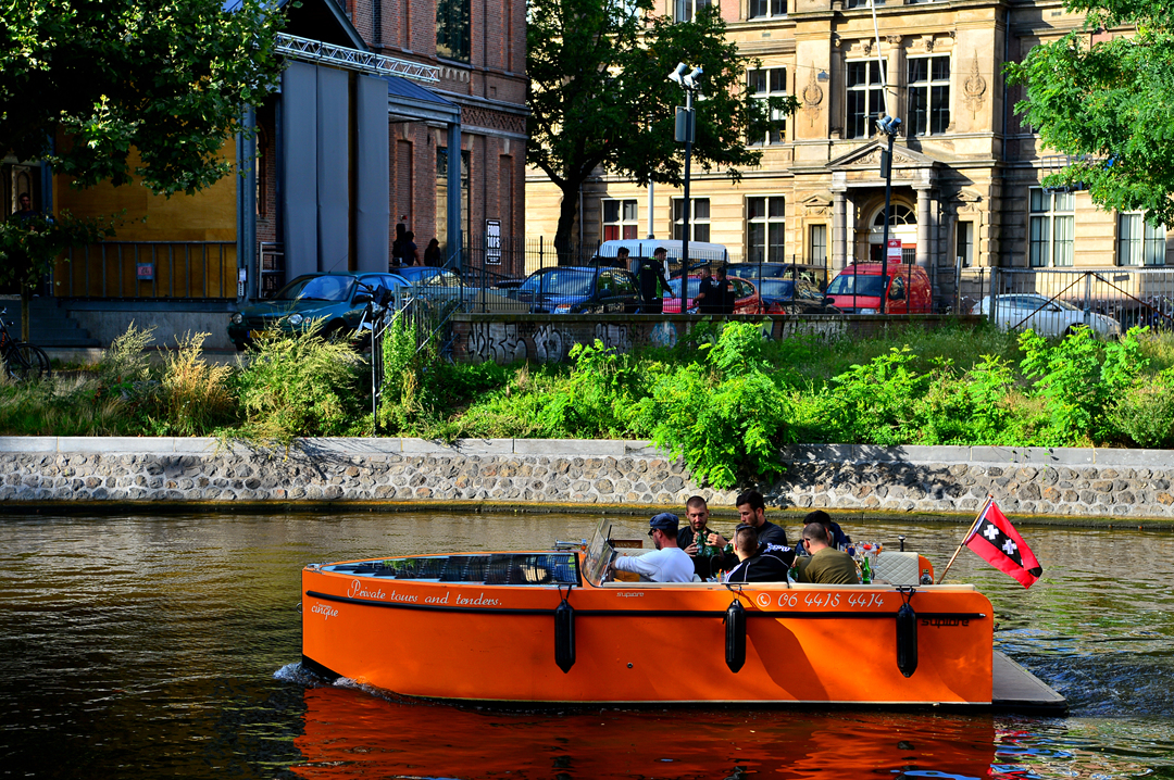 열정적인 빨간색의 수상 버스가 운하를 타고 온다.