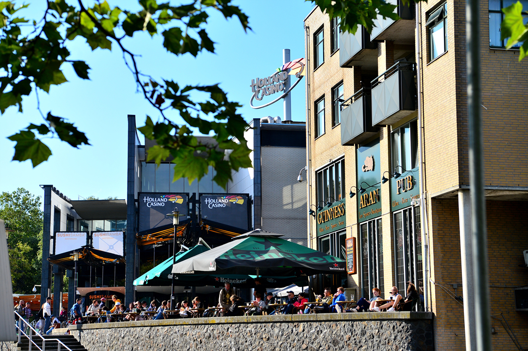 펍의 야외 탁자에는 많은 사람들이 모여 있고, 그 뒤편으로는 카지노 간판도 보인다.