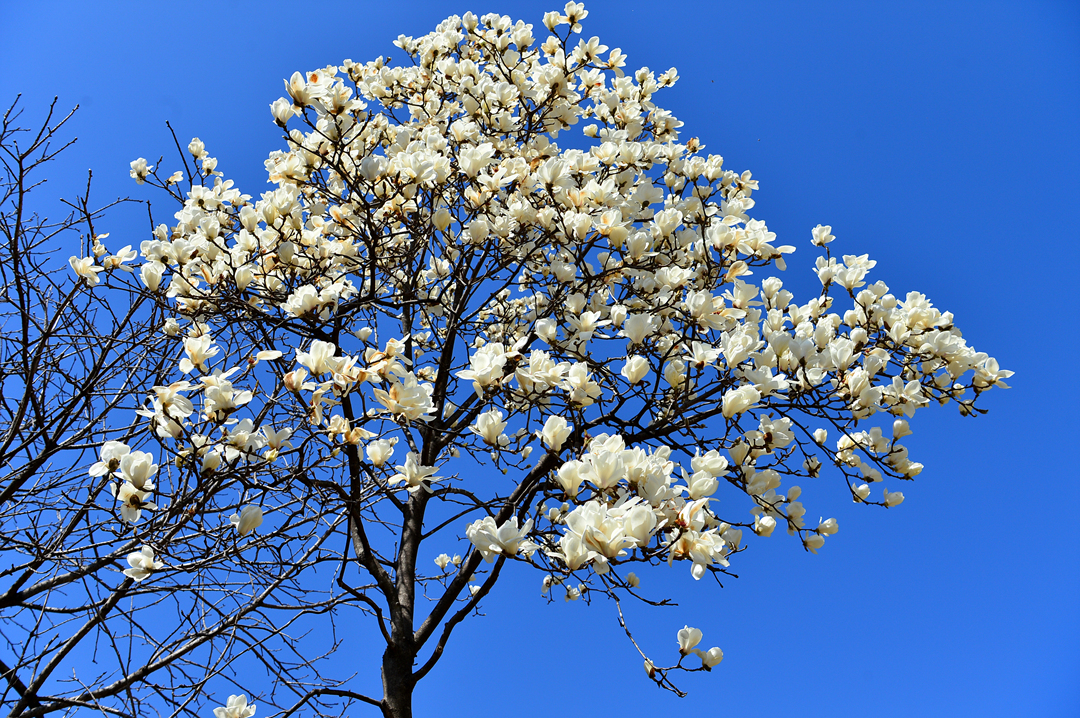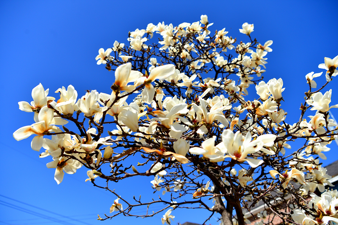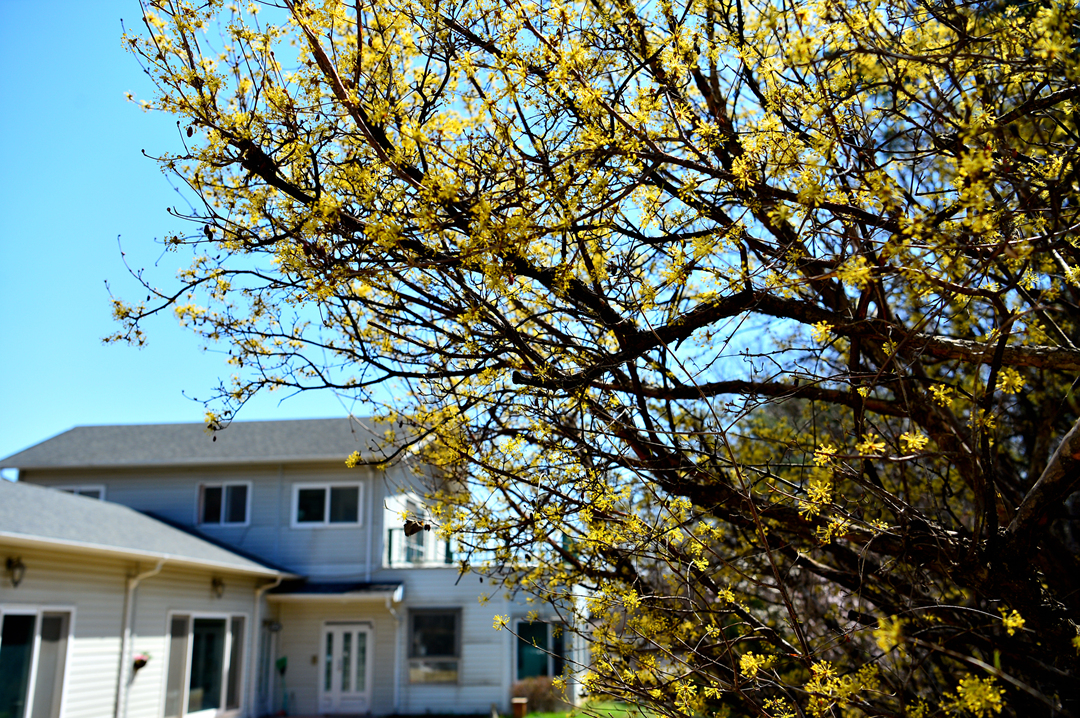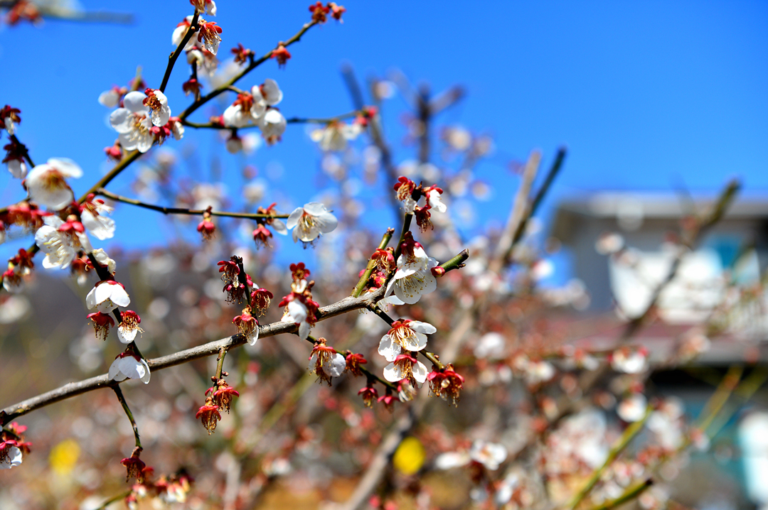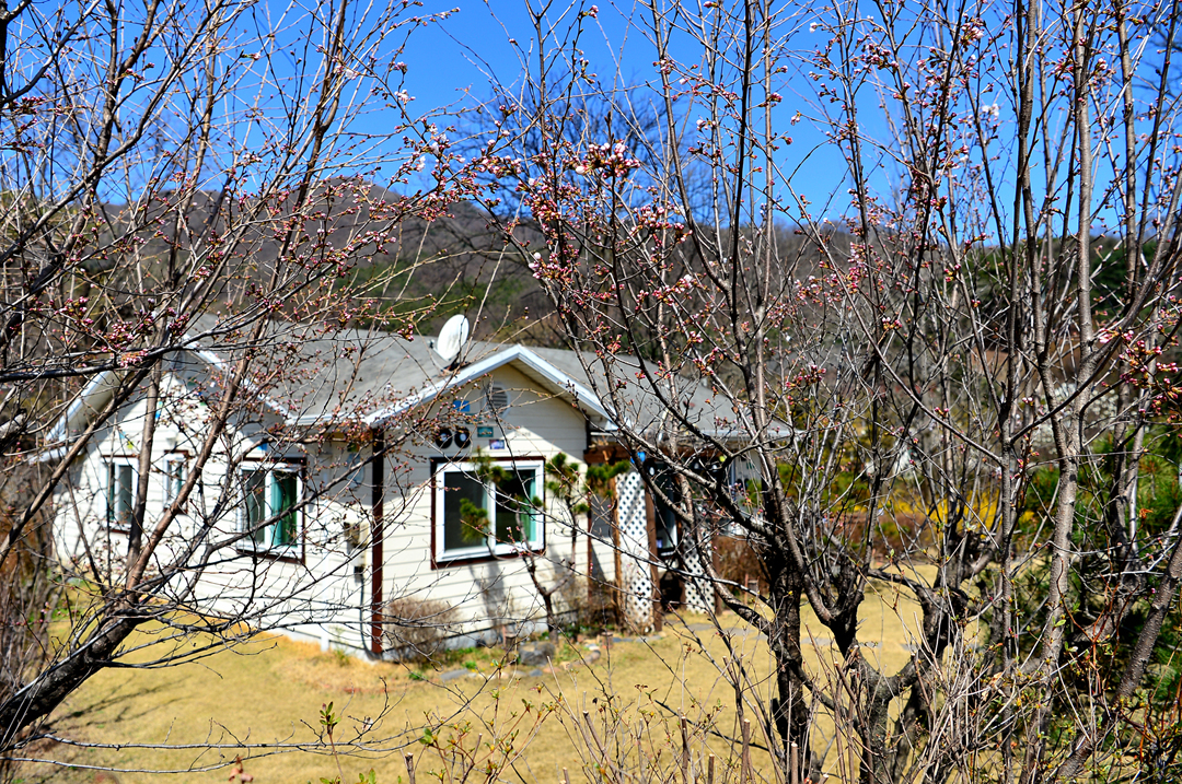 미처 꽃망울을 터트리지 못한 나무들에 둘러싸여 있는 주택 모습이다.