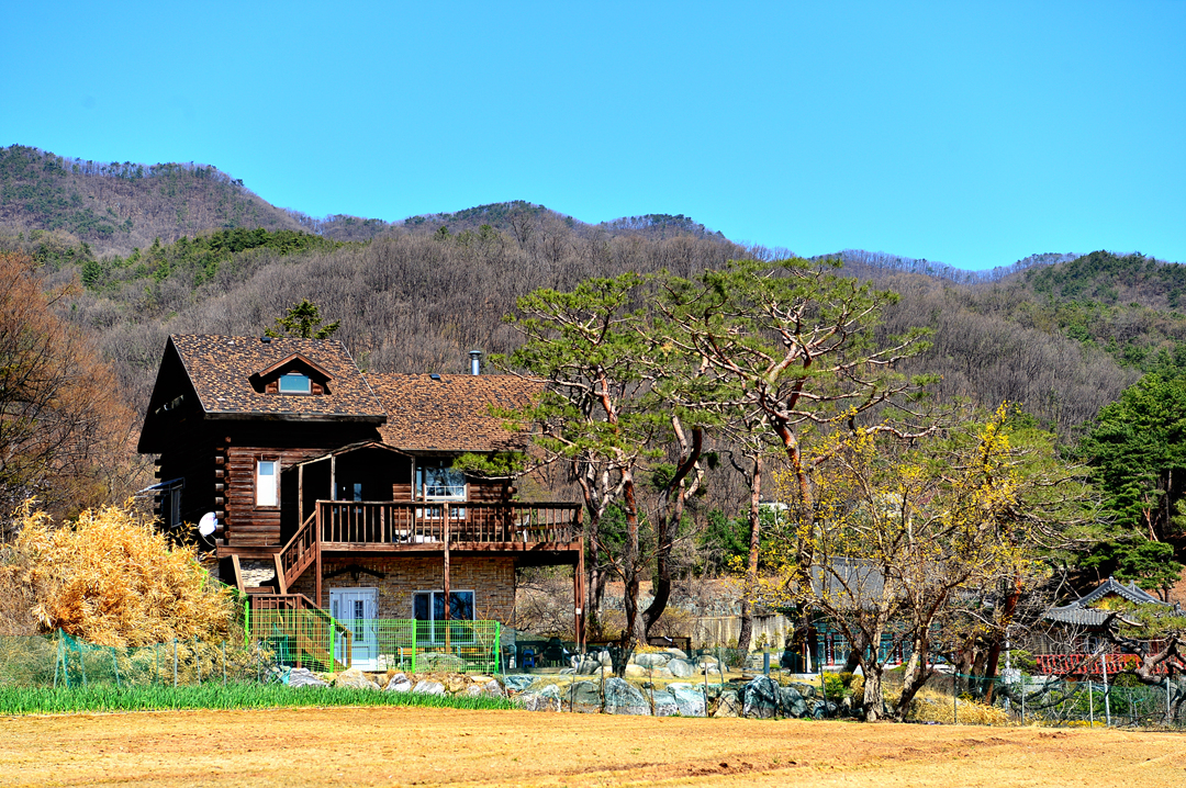 밭 건너편의 목조 주택이 멋지다.