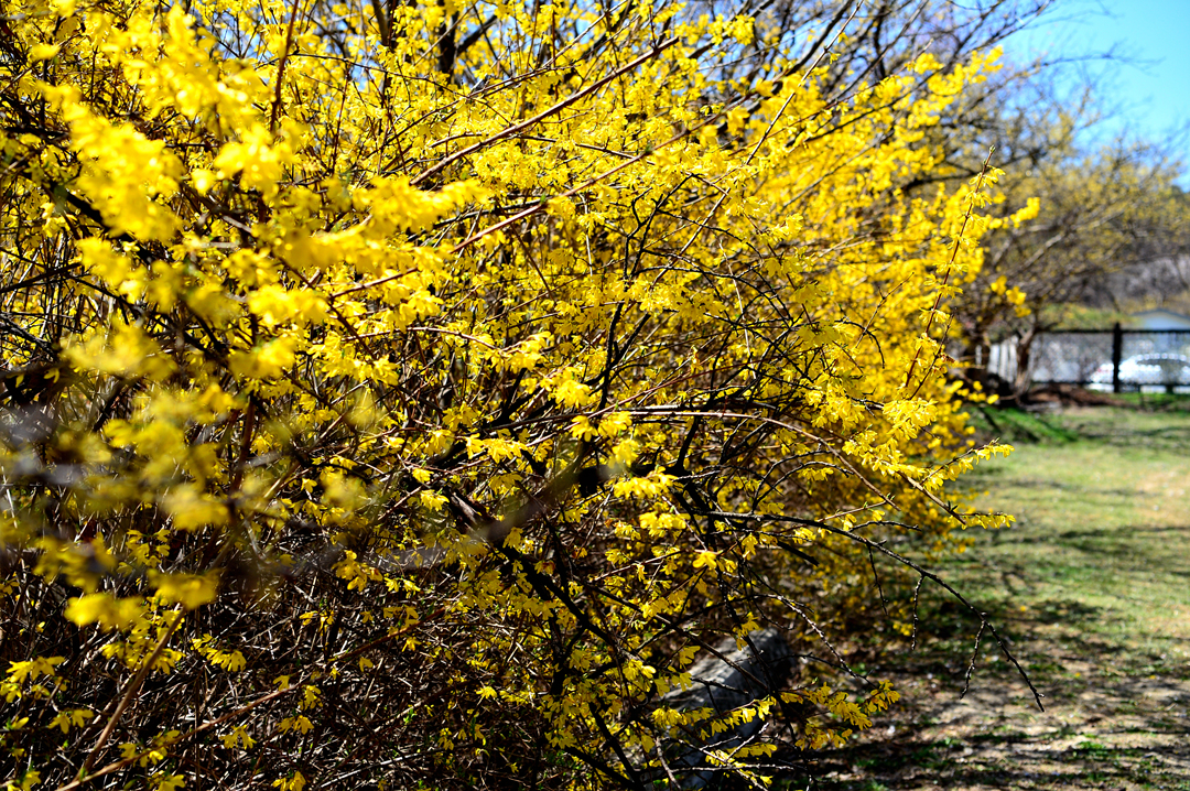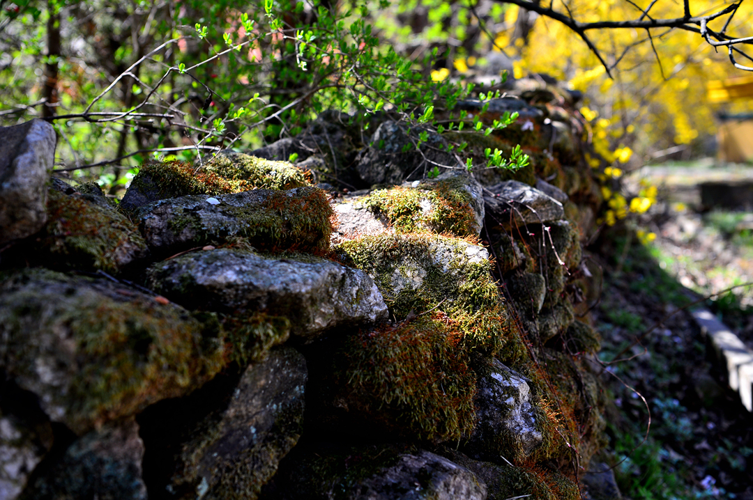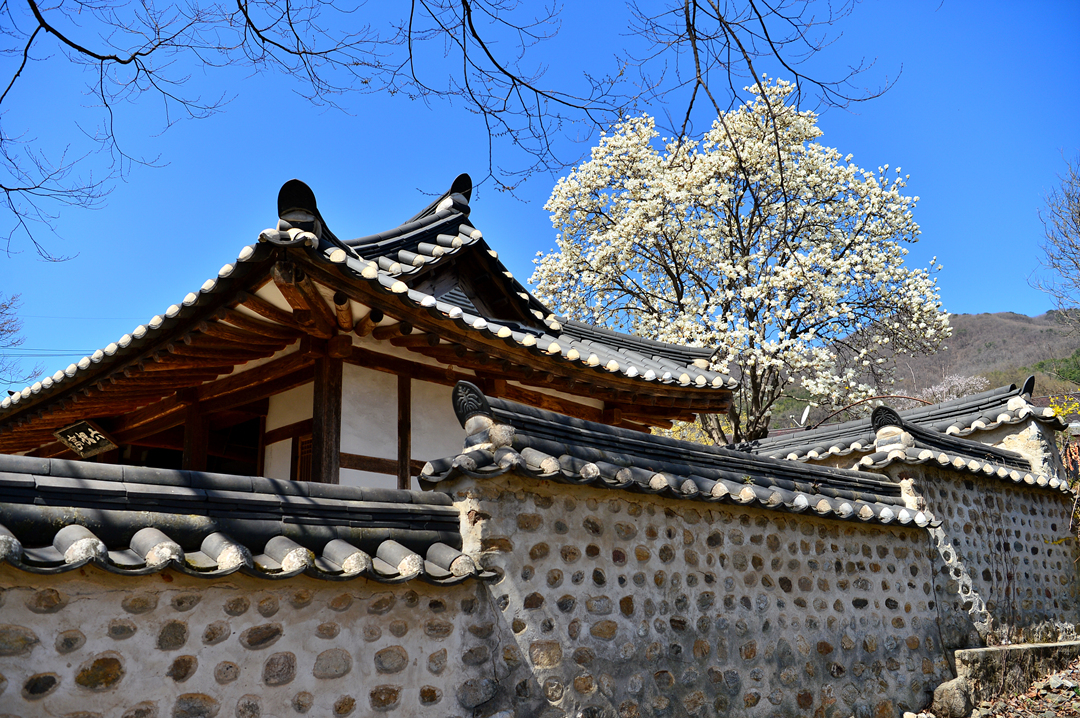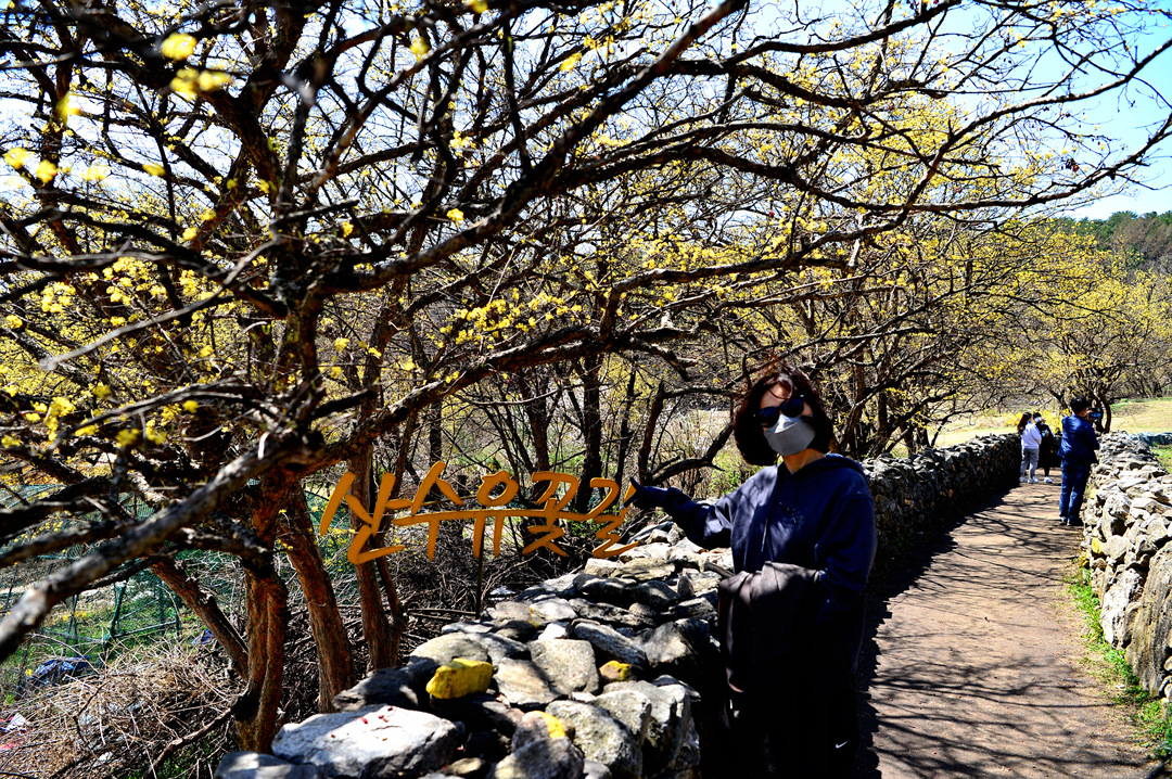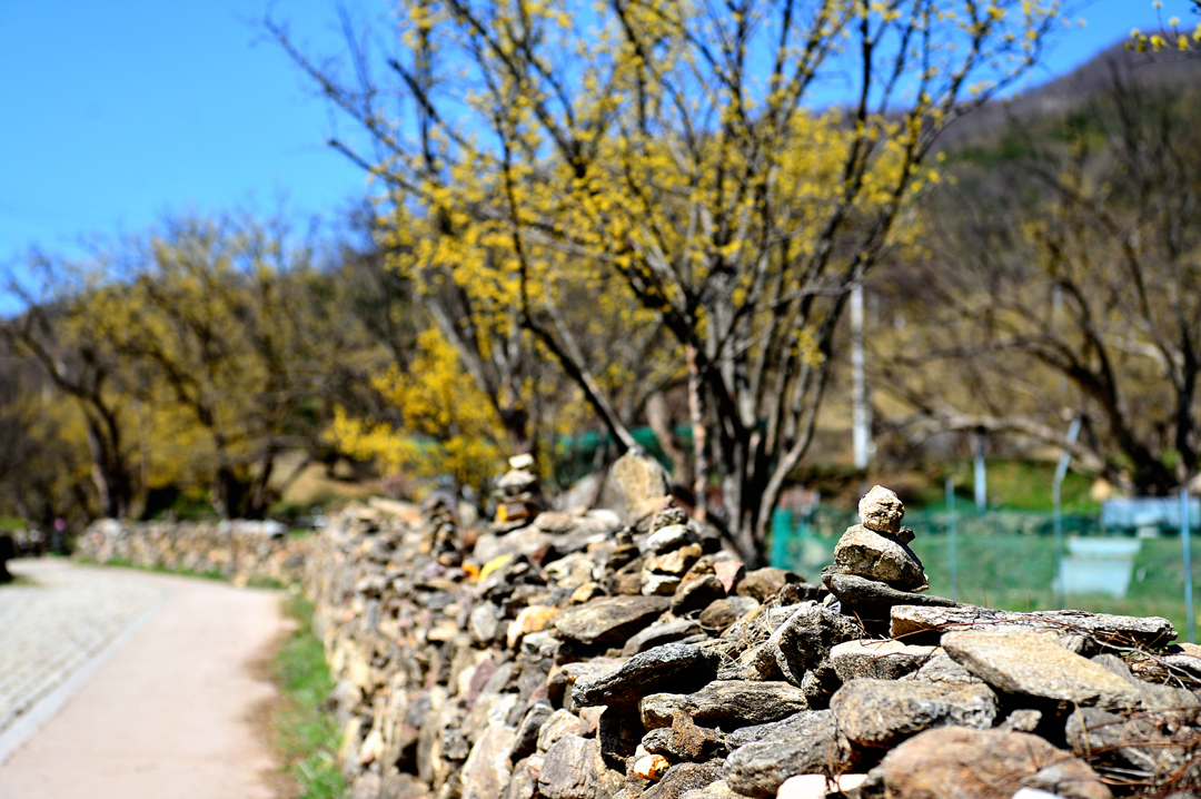 돌담 위에는 봄을 축복하는 듯한 노란 개나리가 화사하게 활짝 피어 있고~