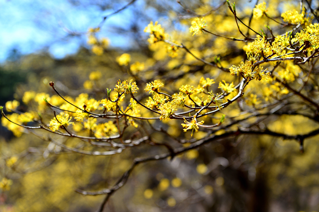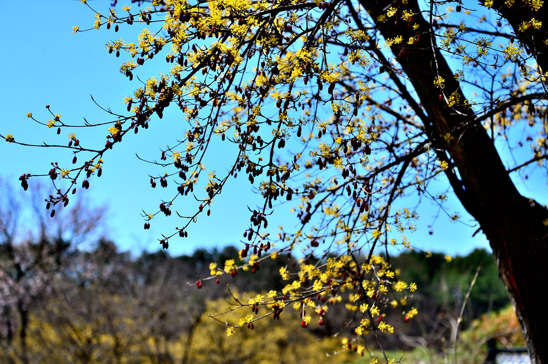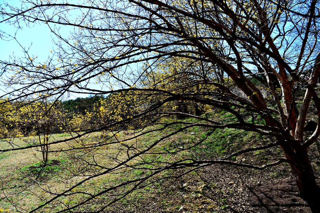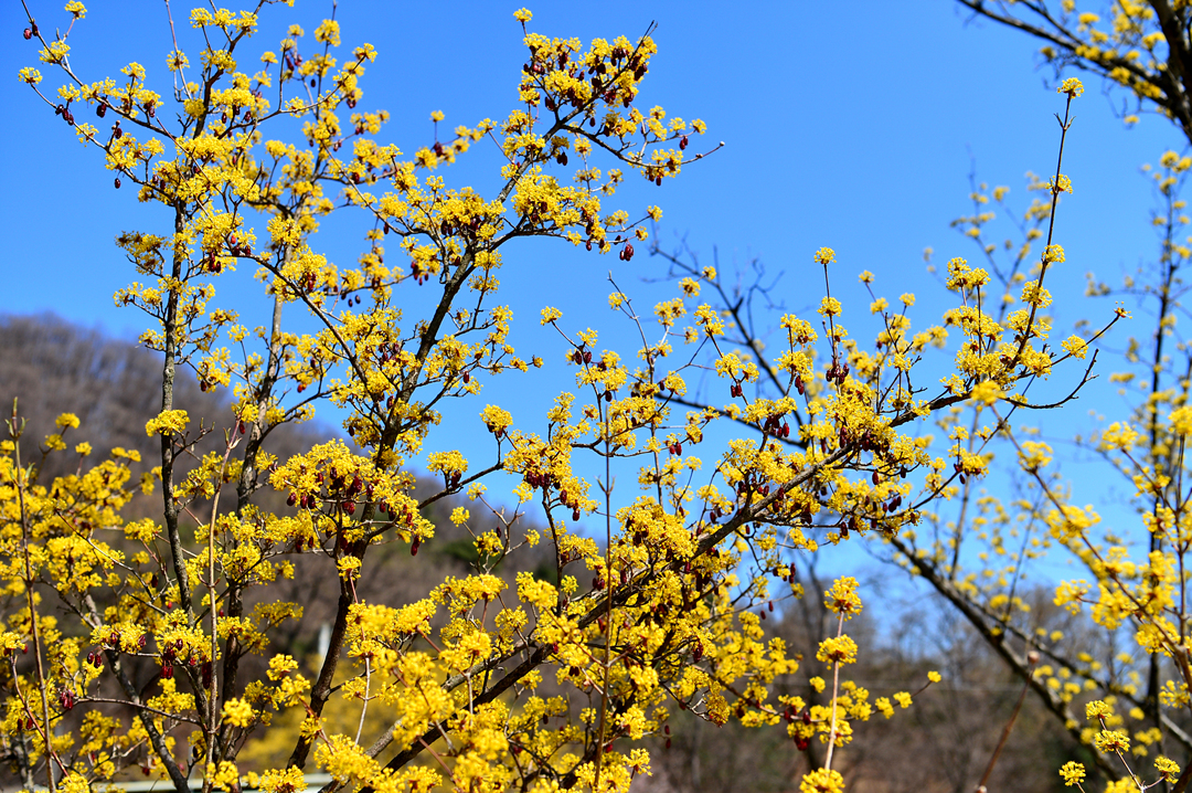 청명한 하늘을 배경으로 한 산수유 꽃이 예쁘다.