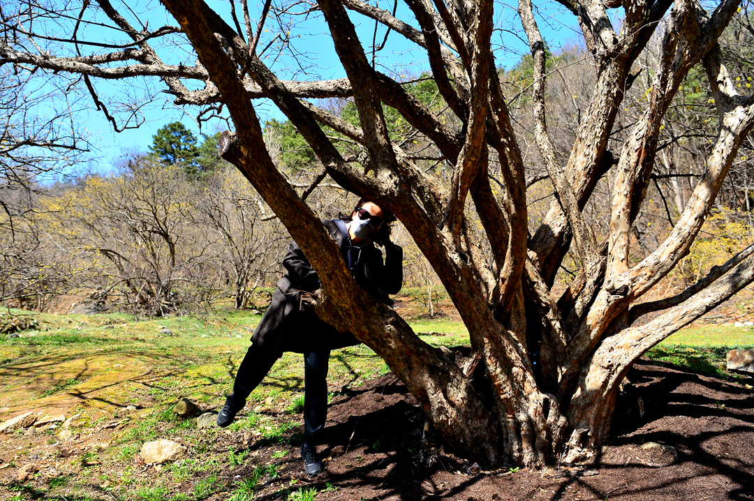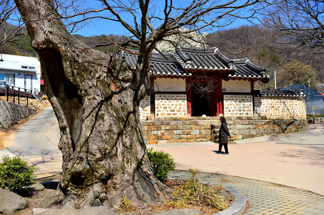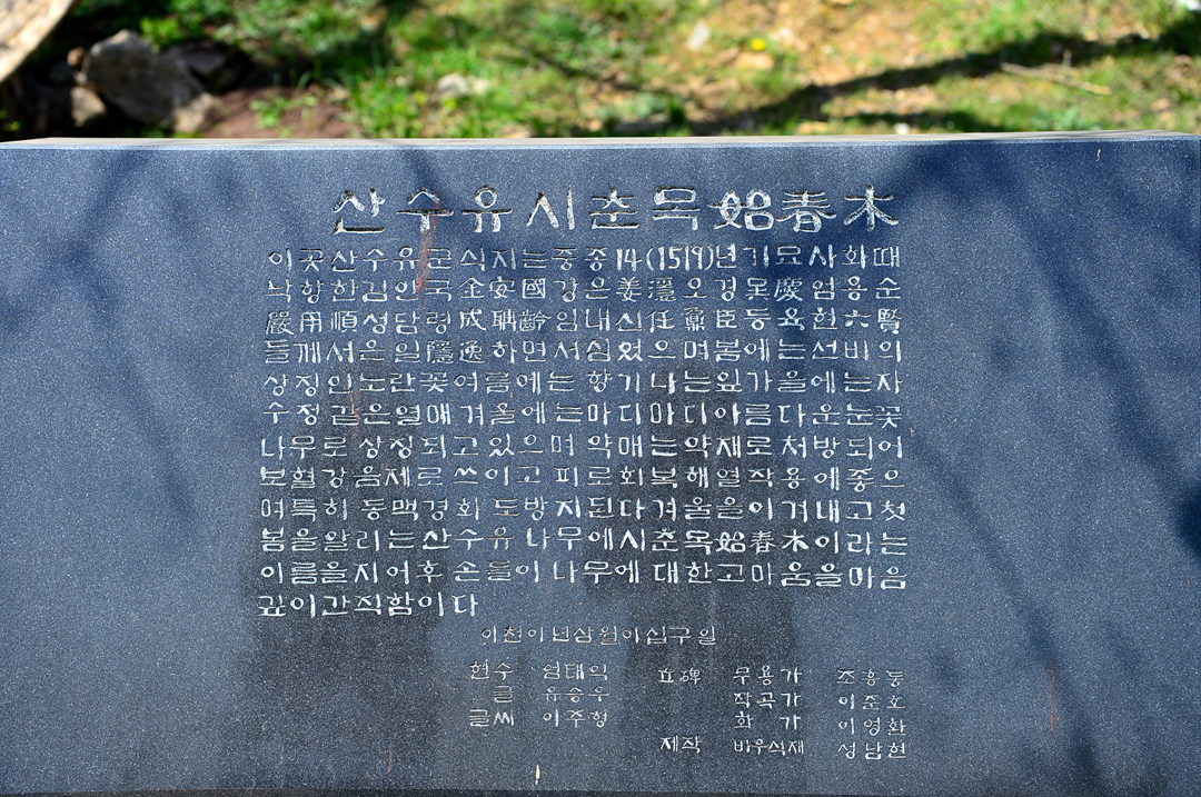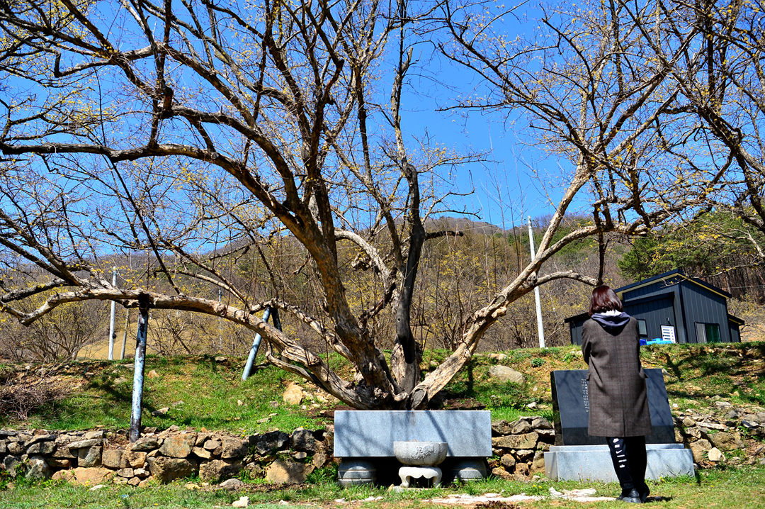 고목이 다된 산수유 나무 앞에 제단이 놓여 있고 그 옆에 비석도 세워져 있다.