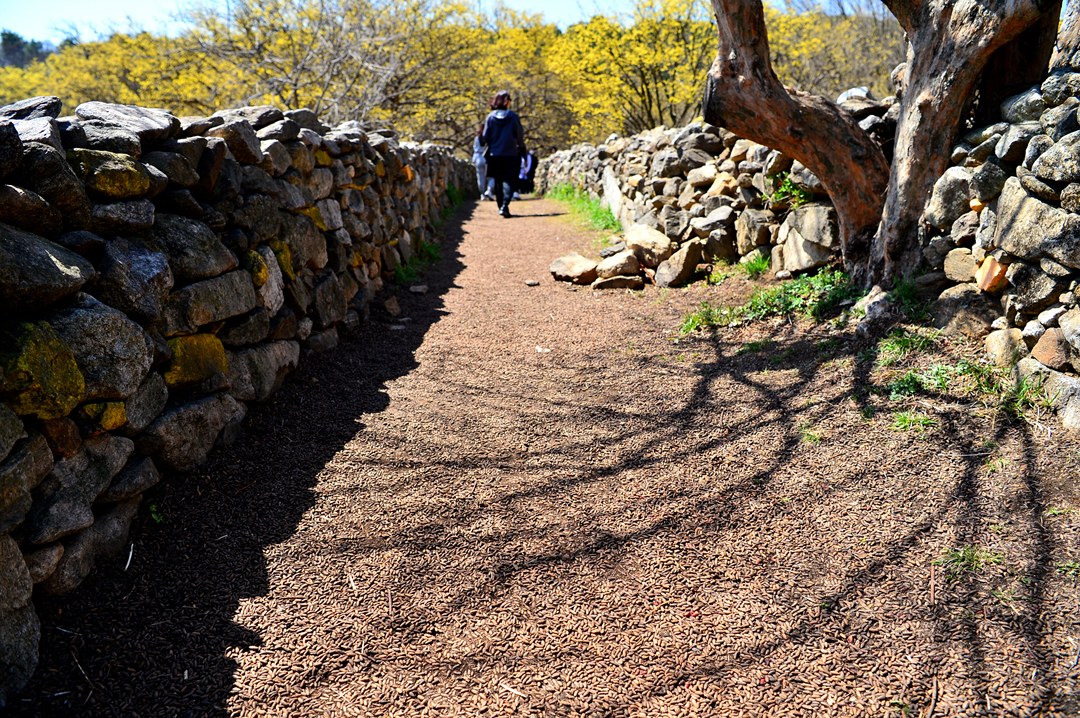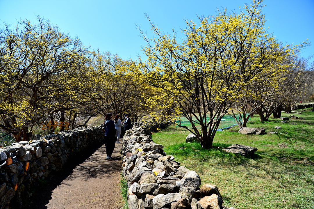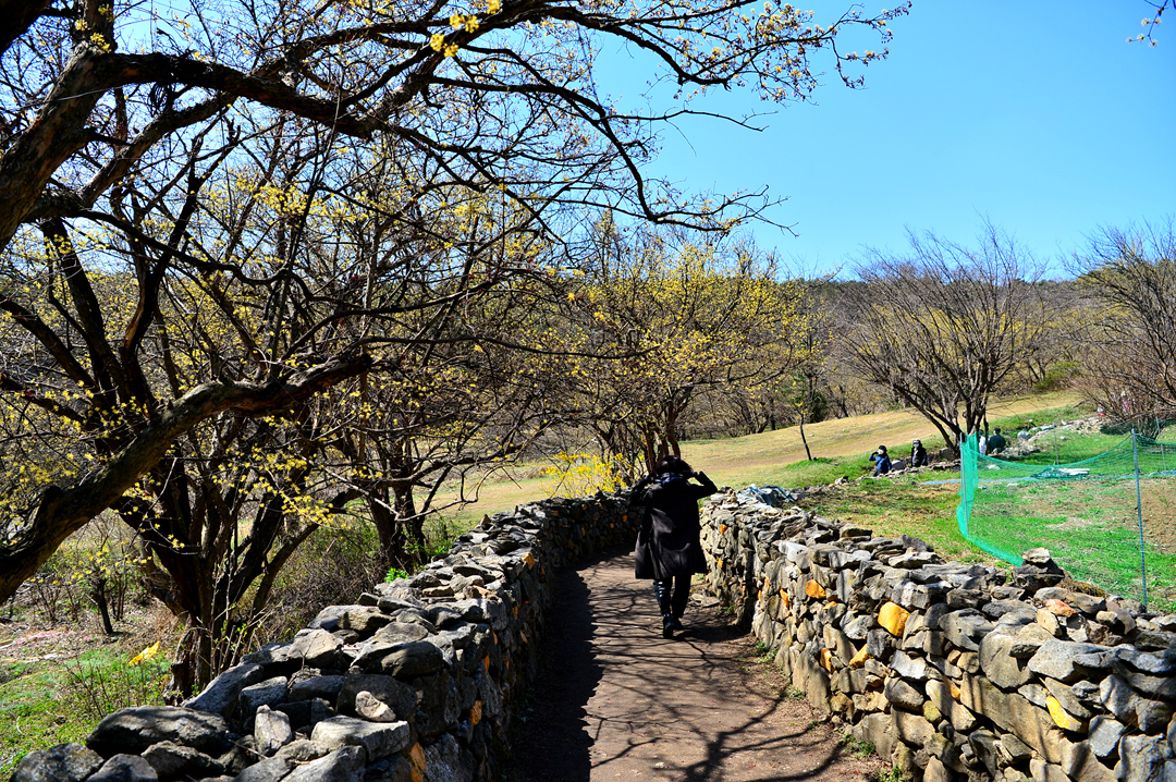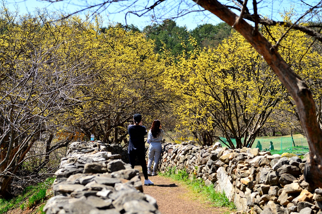 좁은 돌담길 옆으로 산수유가 만발해 있다.
