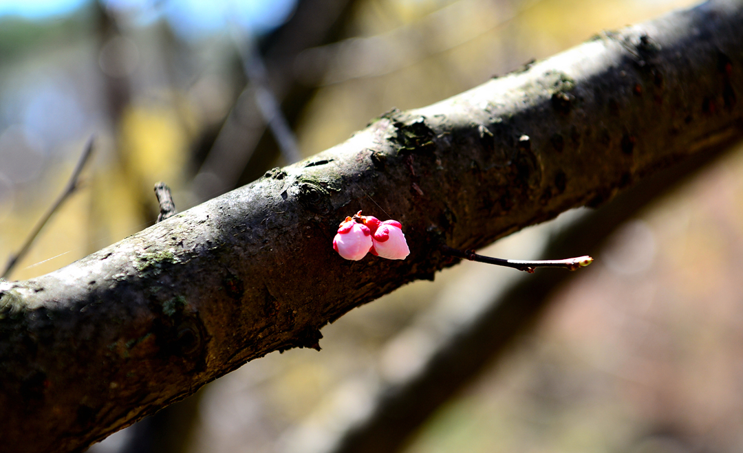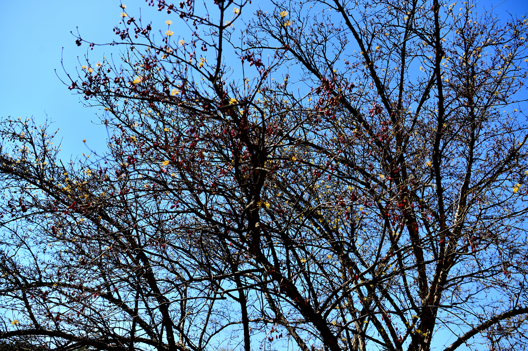 지난 해에 열렸던 산수유가 새로 피어난 꽃과 함께 아직도 가지에 매달려 있는 모습도 보인다.