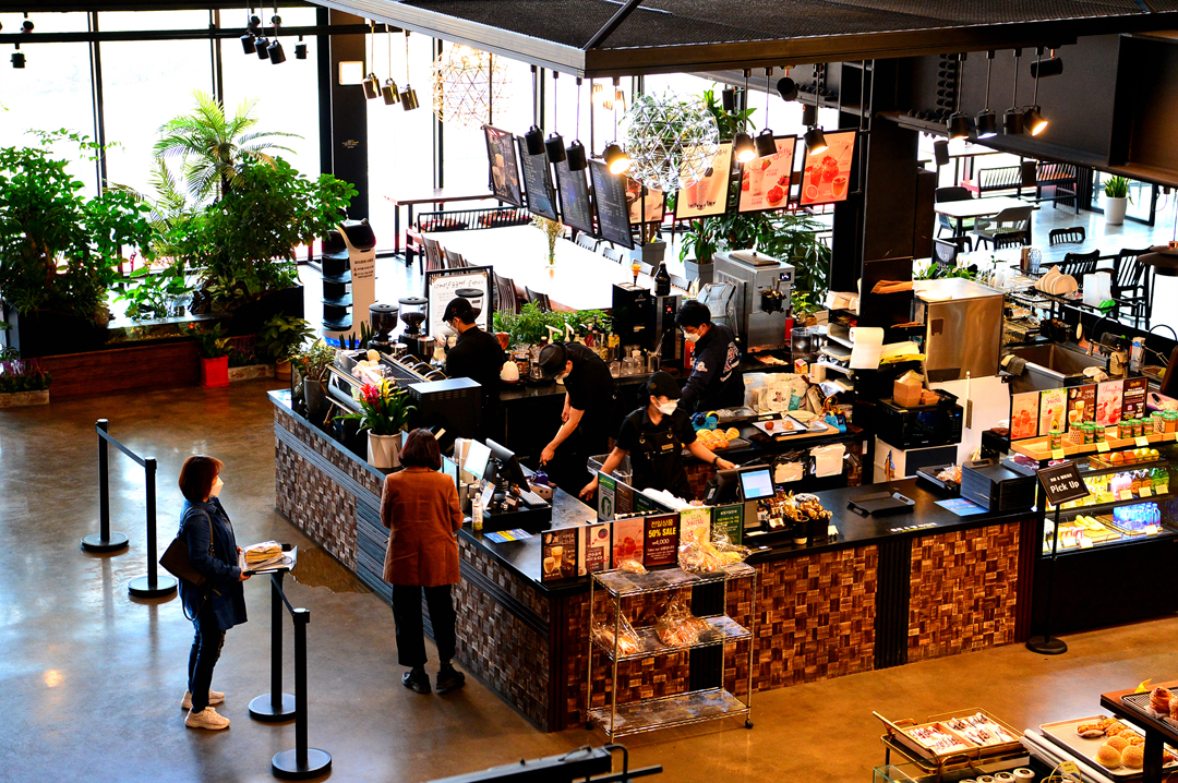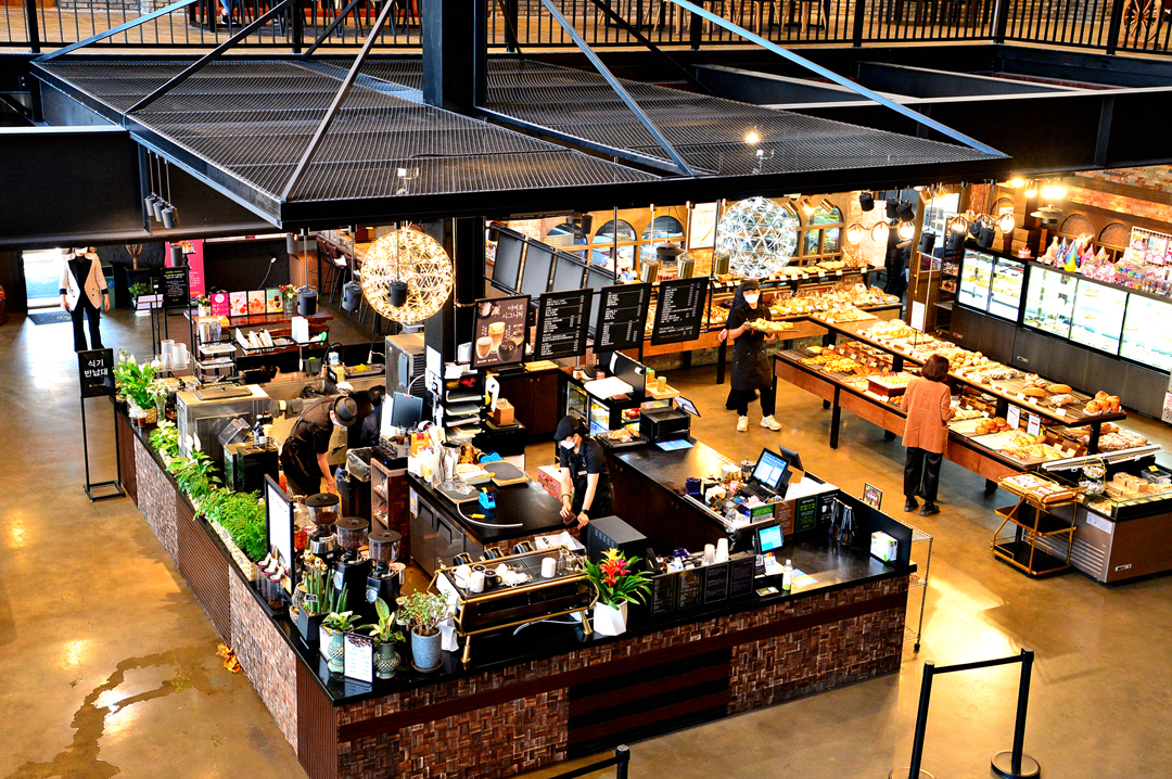 툭 트인 넓은 공간에 마련된 커피 매대와 각종 빵들이 진열되어 있는 모습이다.