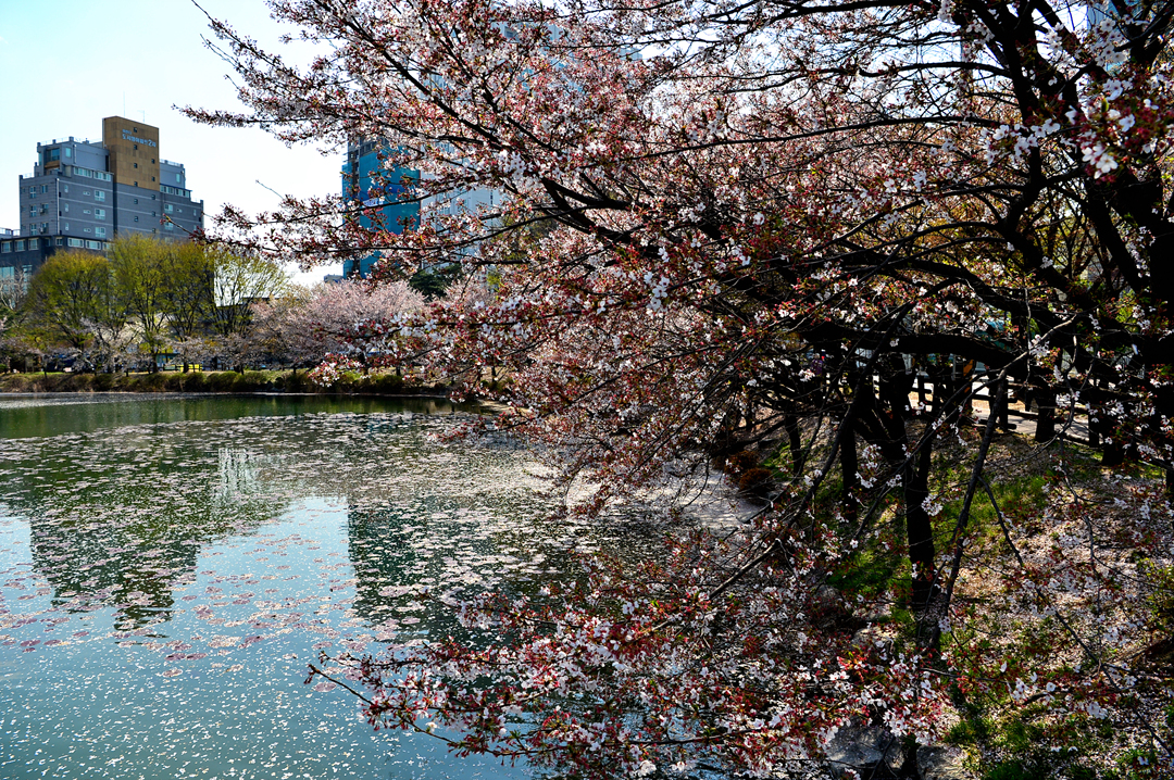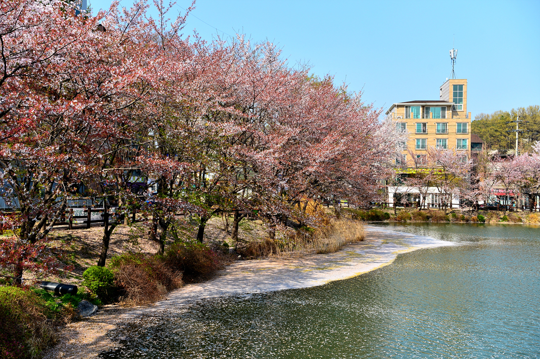 떨어진 벚꽃이 호수면을 가득 채우고 있다.