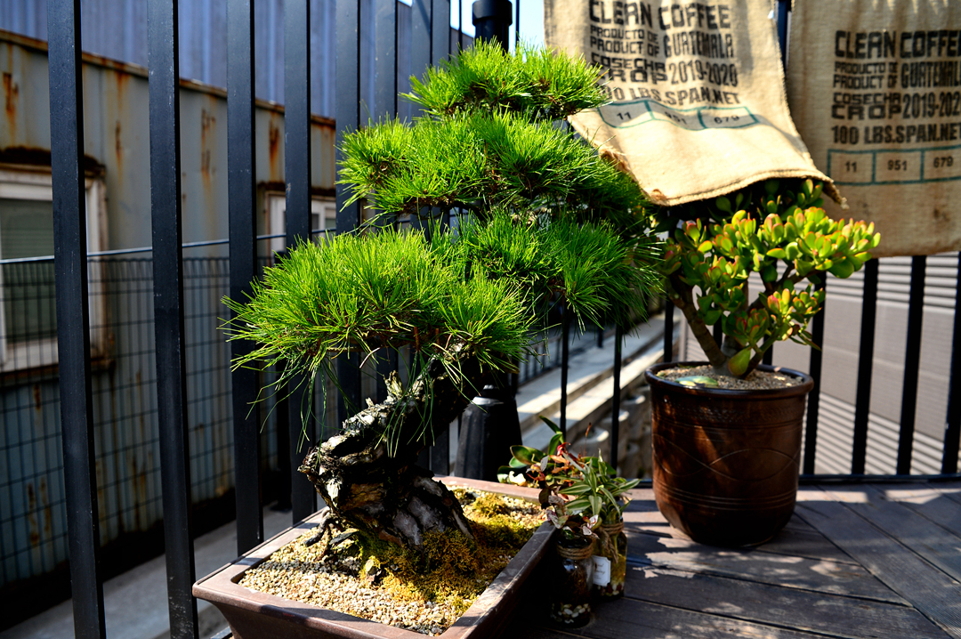 카페의 입구를 장식하고 있는 도자기와 소나무 분재 모습이다.