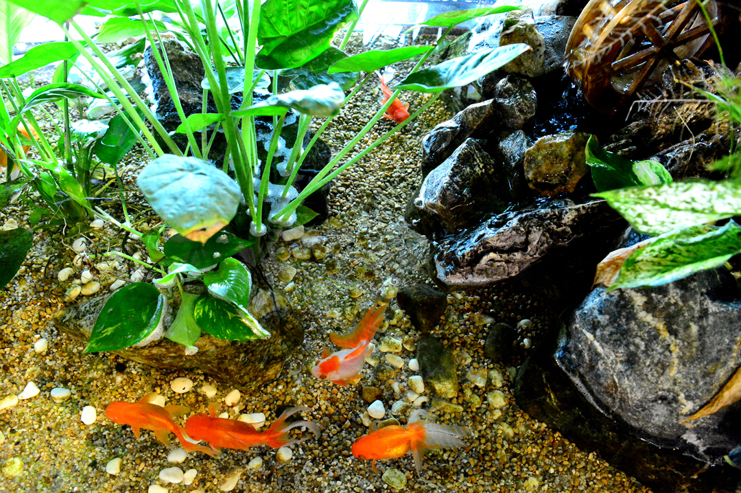 작은 수조 안 금붕어의 여유로운 유영이 편안한 느낌을 더해 준다.