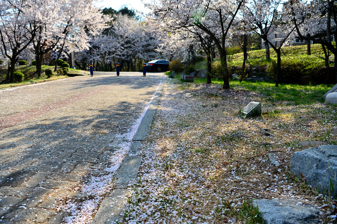 바닥에는 꽃눈이 내려 하얗게 변해 있다.