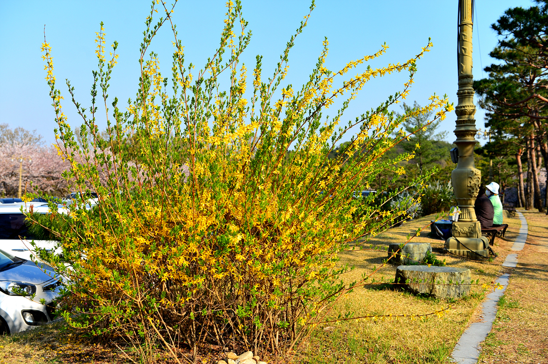 노란 개나리가 푸른 옷으로 바꿔 입으며 계절의 흐름을 가르쳐준다.