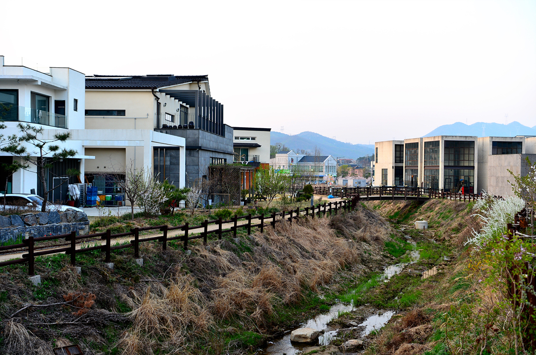 마을을 가로지르고 있는 실개천에는 아름다운 꽃들이 피어 있고